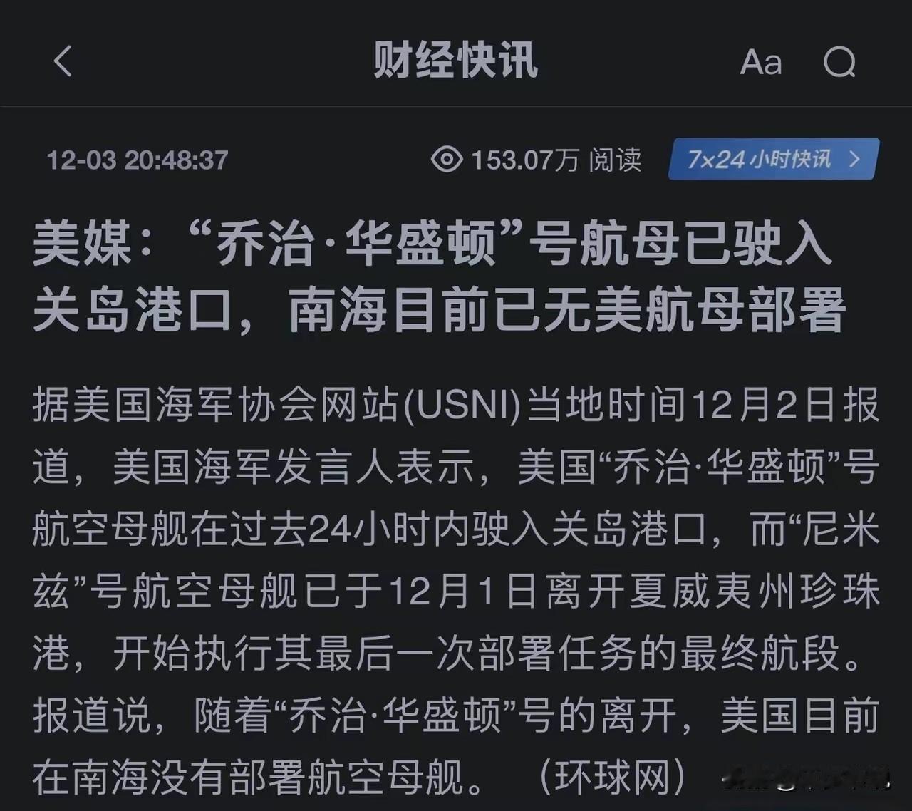 跑了,都跑了,日本最大的依仗没有了 根据美国海军协会官网报道之前部署在亚洲的乔治·华盛顿号航母已经驶入关岛港口,加上之前坠机之后也跑了的尼米兹级航母,美国在亚洲已经没有任何一艘航母部署。 本来美国航母是日本最大的依仗,现在美国的航母全部撤走了,日本最大的依仗也就没有了。再结合之前特朗普警告高市早苗的传闻,那么是不是说美国已经对日本放任不管了。