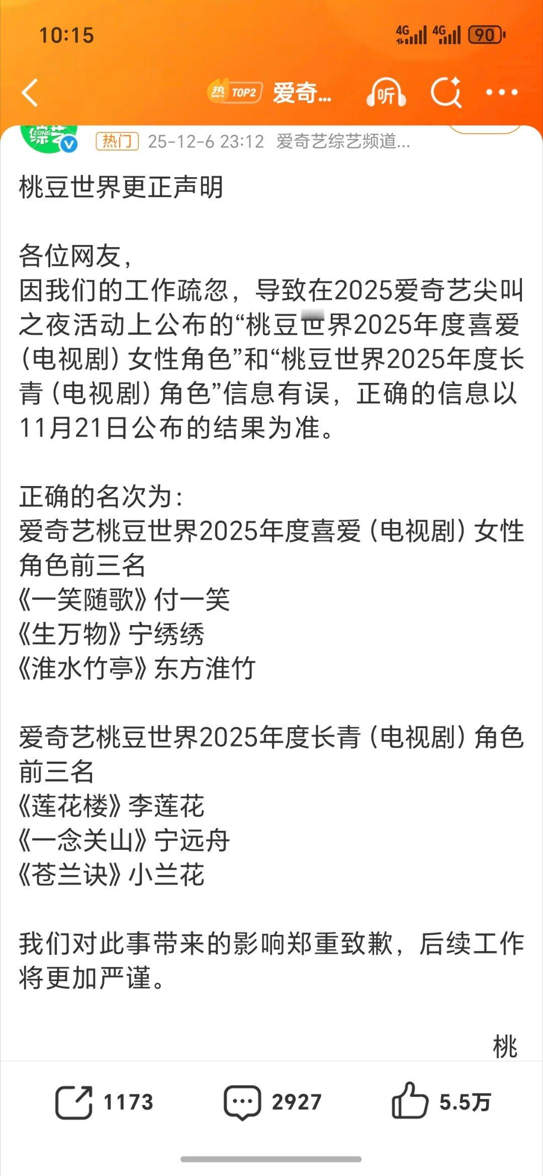 爱奇艺年度喜爱女性角色🥝对年度喜爱女性角色的榜单错误出来道歉了,🥝对白鹿是不