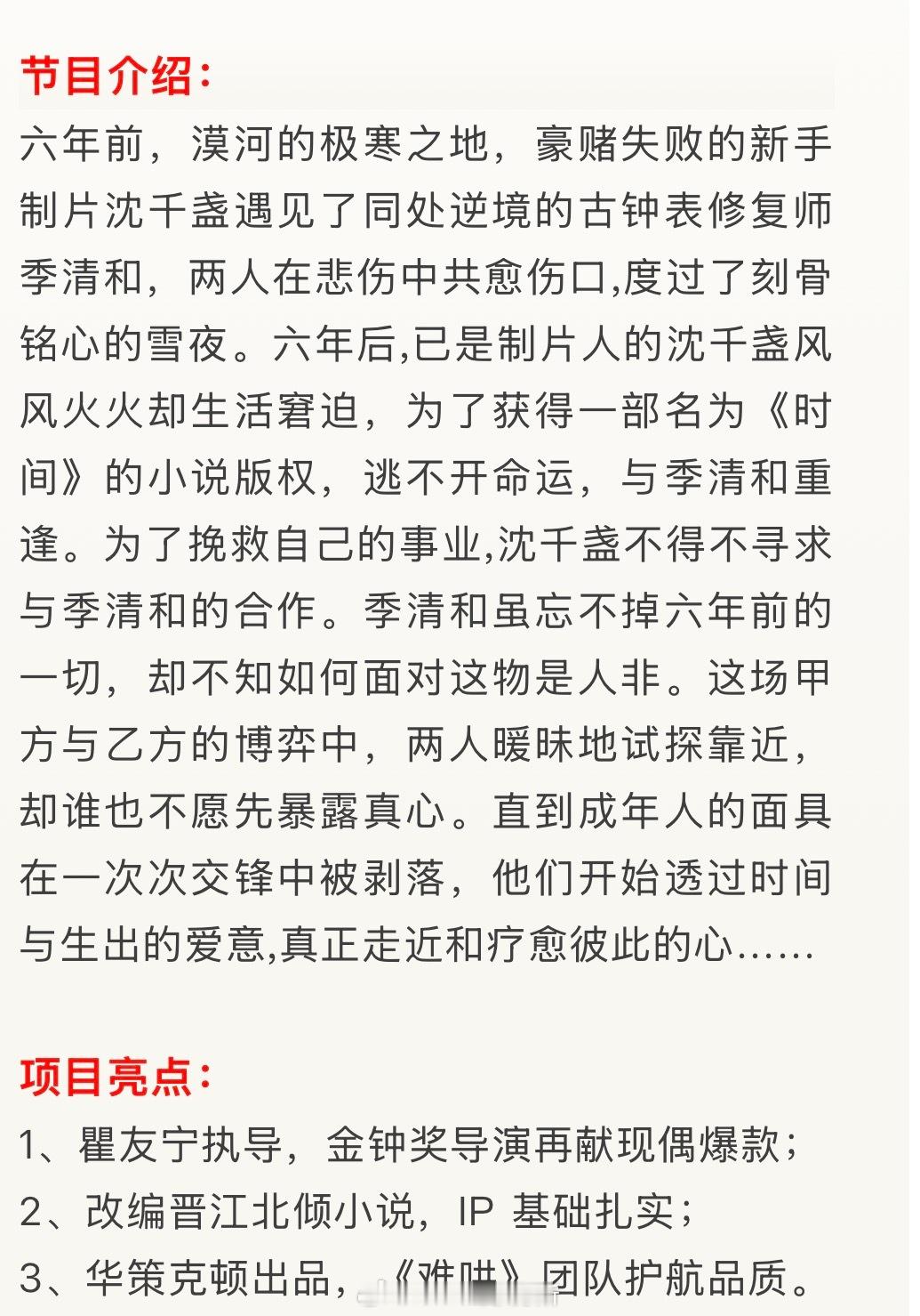 华策克顿剧集《你那儿几点》招商看点(《难哄》团队护航品质)主演:章若楠、王安宇导演:瞿友宁《难哄》 开机时间:预计26年1月拍摄地:上海
