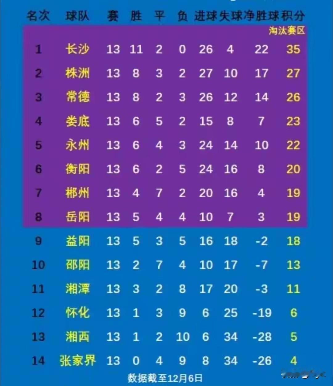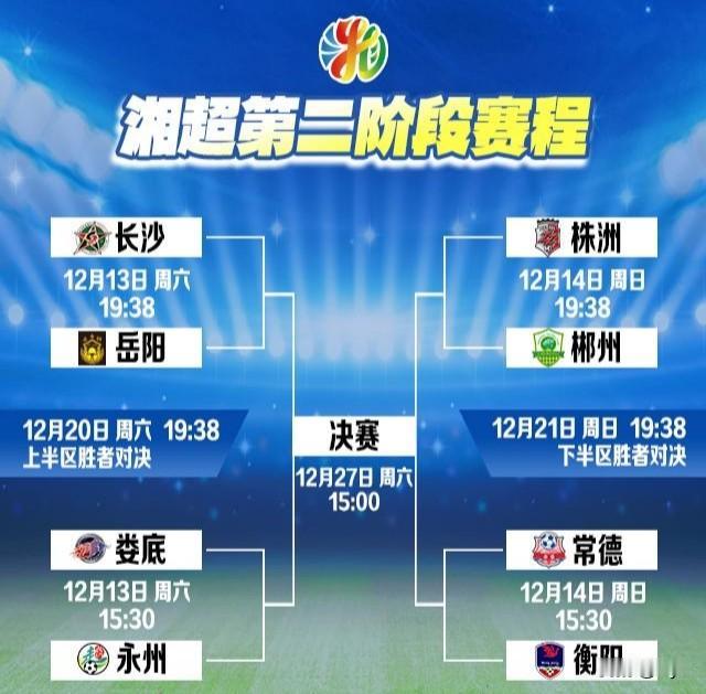 湘超第二阶段赛程和八强对阵已经敲定, 这届赛事的冠军, 我看好长沙队拿下。 本赛季长沙队的表现实在太亮眼, 13轮踢下来11胜2平保持不败, 进攻端轰进26球火力拉满, 防守端只丢了4球, 净胜球22个、积分35分, 直接以断层优势领跑积分榜, 攻防两端的统治力没话说。 按赛程, 12月13日长沙先碰岳阳, 以他们这状态拿下这一场基本没悬念; 之后对上半区的胜者(娄底或永州晋级队), 以长沙的硬实力, 闯进决赛是大概率的事。 下半区那边, 株洲和常德都是强队, 最后应该是这两队里的一支进决赛, 但不管决赛对手是谁, 长沙队的进攻和防守都比其他队高出一截, 拿冠军的底气很足。 不出意外的话, 本届湘超的冠军奖杯, 会留在长沙队的荣誉室里。