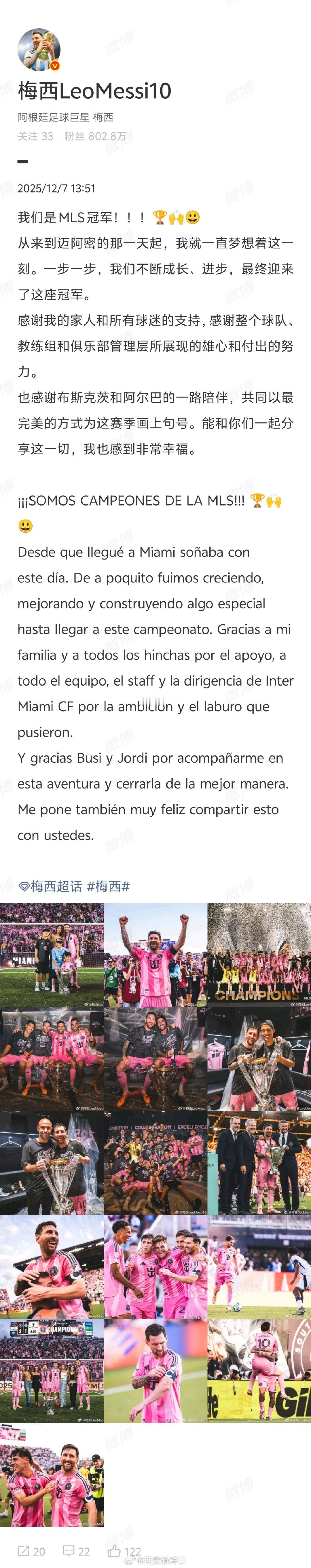 【梅西说来到迈阿密就梦想着这一刻】迈阿密国际3比1温哥华白浪首夺美职联总冠军!梅西助攻双响。随后,美职联官方发文:梅西以职业生涯第48座冠军奖杯刷新了自己保持的纪录。梅西生涯第48冠12月7日,发文:我们是 MLS 冠军!!!从来到迈阿密的那一天起,我就一直梦想着这一刻。一步一步,我们不断成长、进步,最终迎来了这座冠军。感谢我的家人和所有球迷的支持,感谢整个球队、教练组和俱乐部管理层所展现的雄心和付出的努力。也感谢布斯克茨和阿尔巴的一路陪伴,共同以最完美的方式为这赛季画上句号。能和你们一起分享这一切,我也感到非常幸福。
