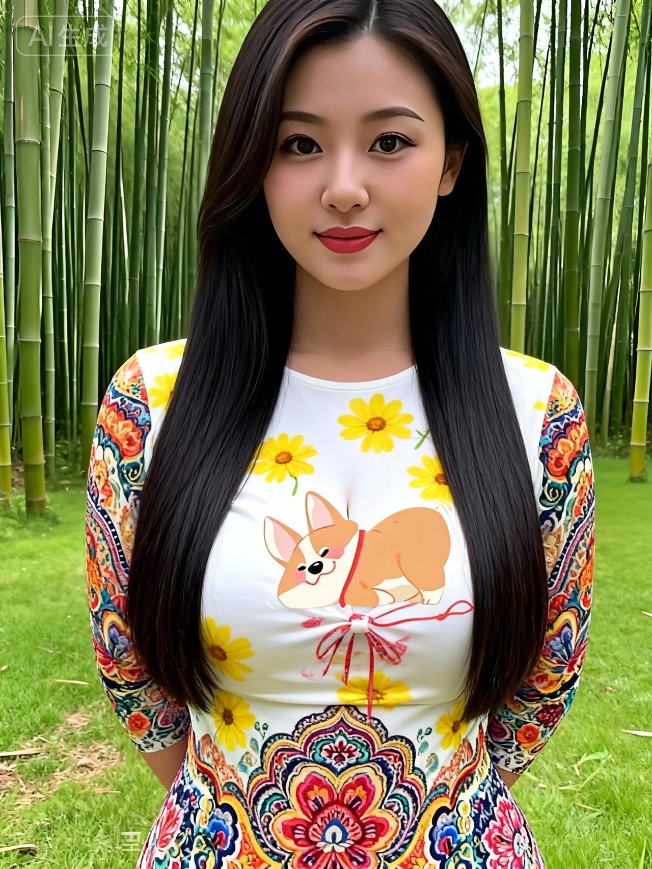 竹林中的甜美女孩,穿着花裙子,萌宠相伴,清新自然!🌿💐🐰