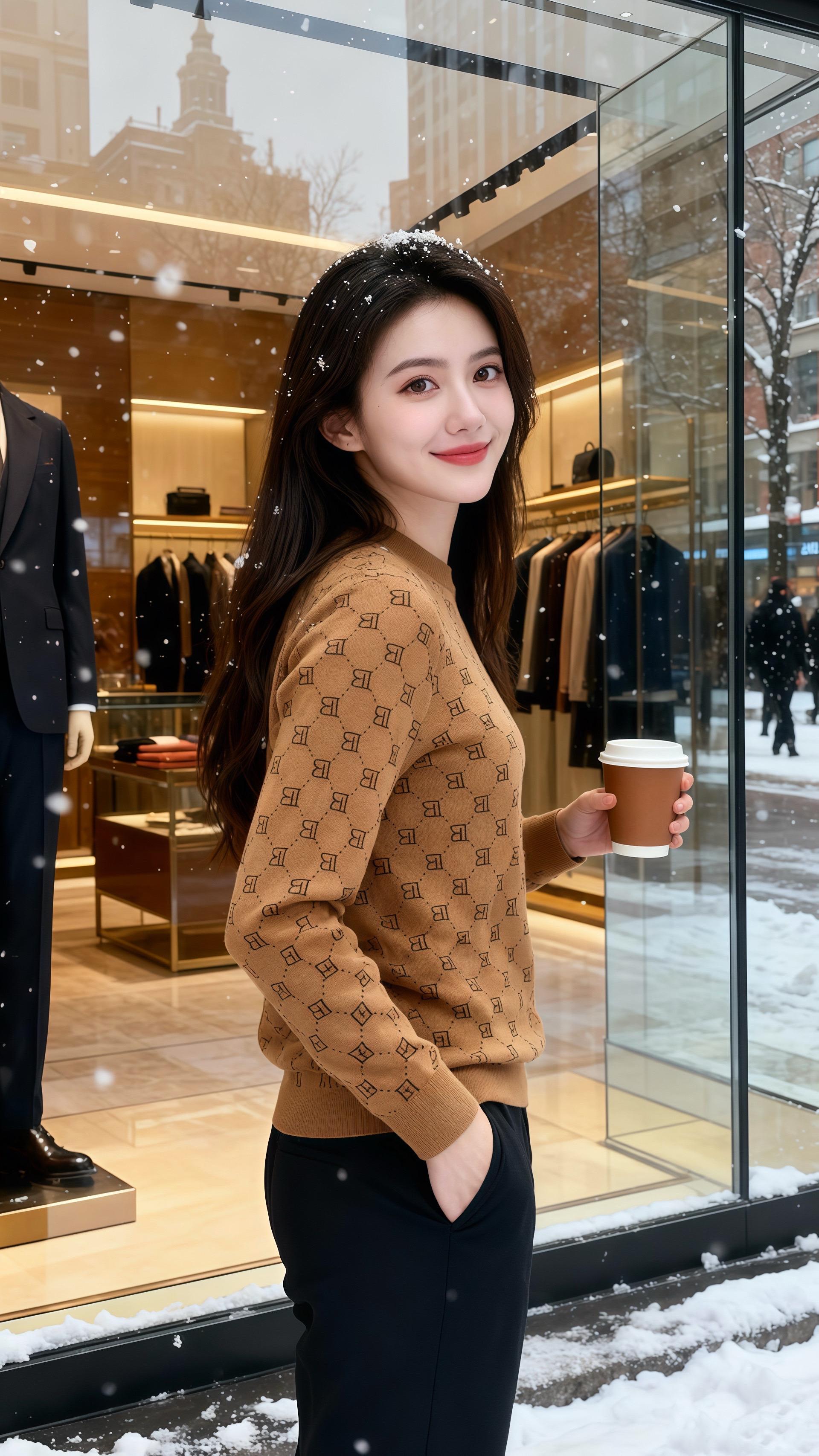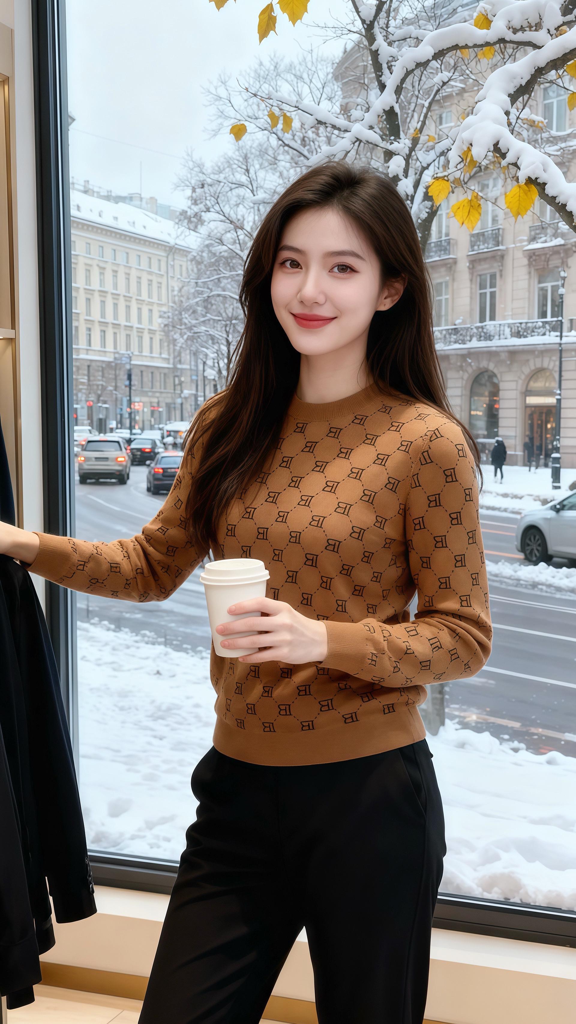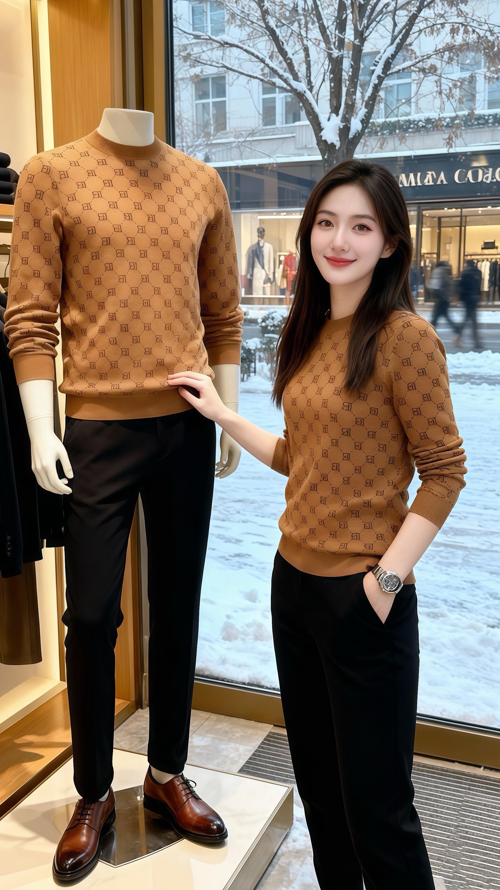 雪粒敲着男装店的玻璃时,许妍正指尖翻着杂志页——焦糖色提花针织衫的纹路顺着手臂弯出软弧,暖棕的调调裹着肩线,像把冬日的冷意揉进了杯热拿铁。