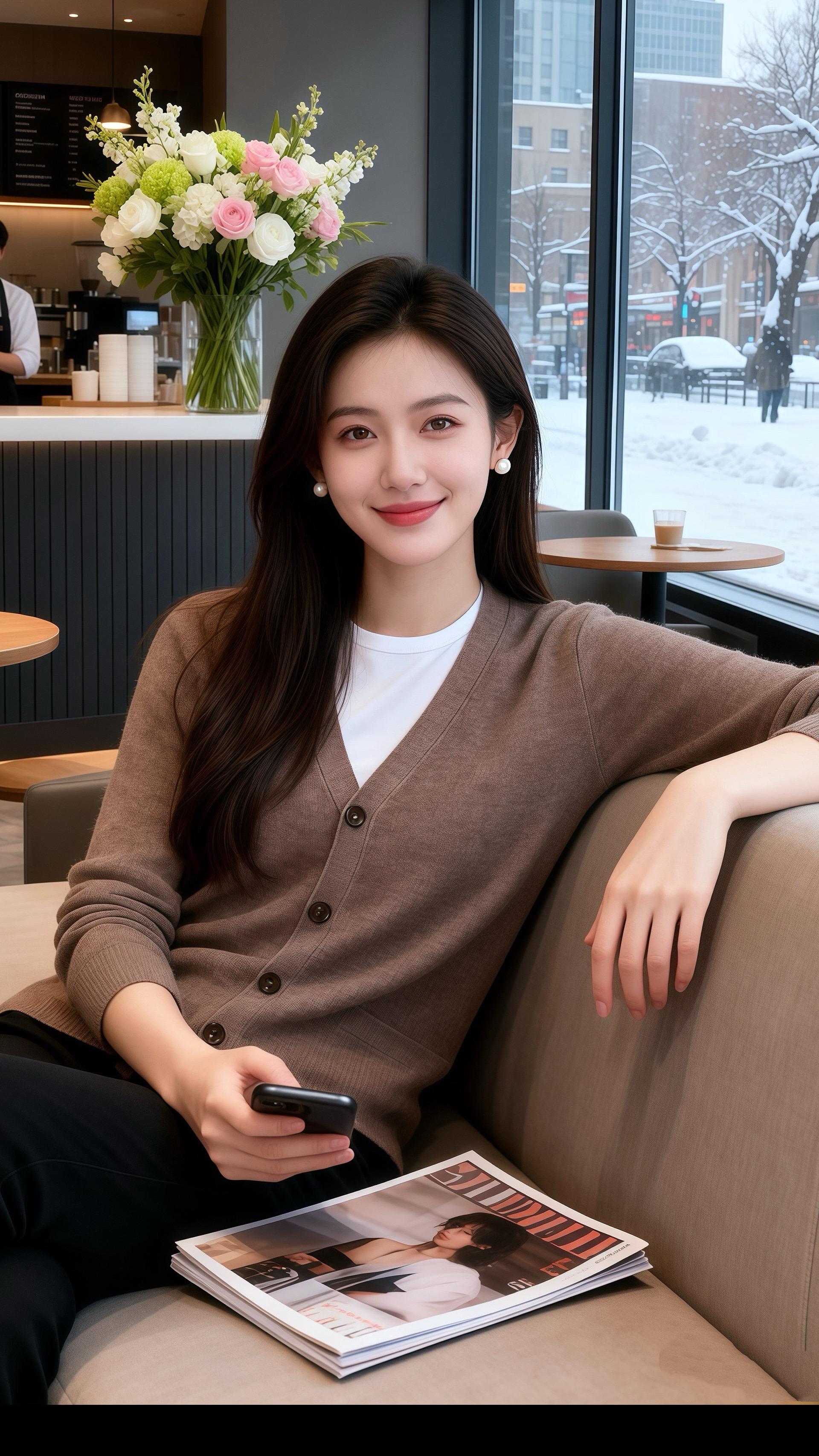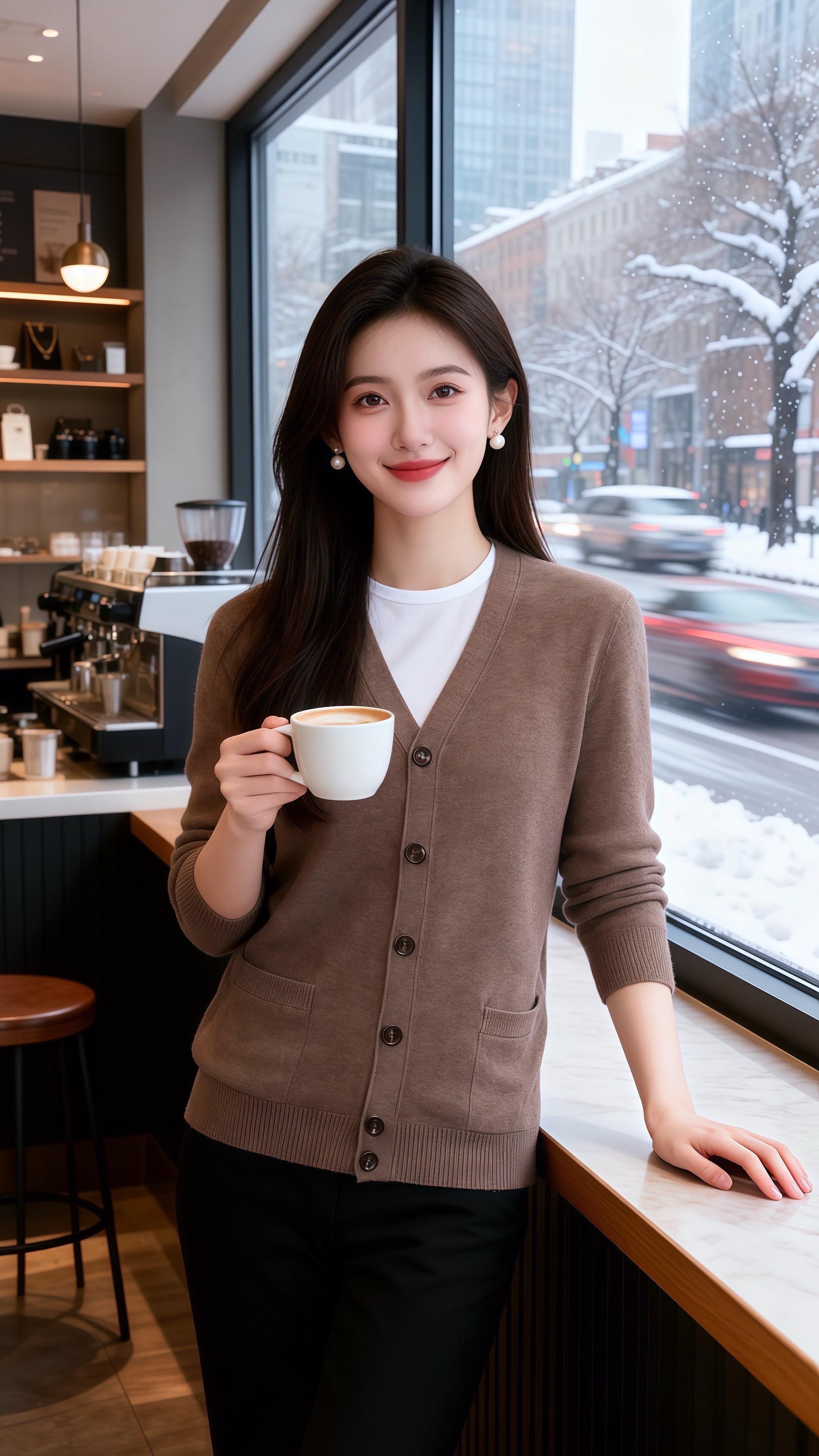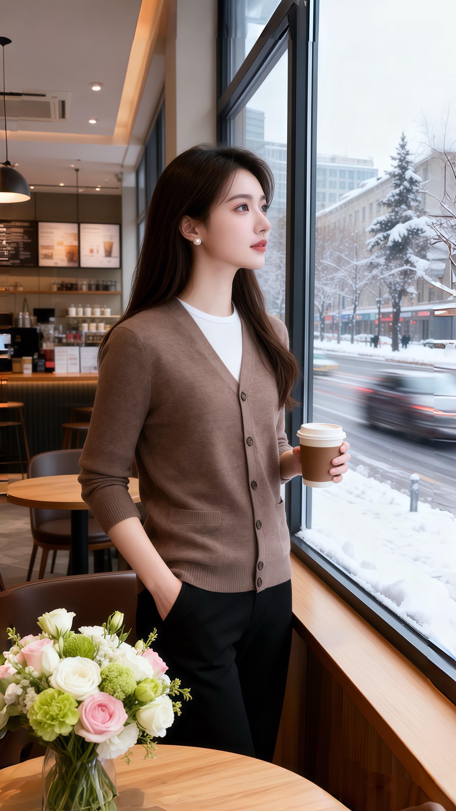 她穿咖色V领针织开衫,柔糯的面料贴合身形,衣身的贴袋设计添了几分随性的细节,单排纽扣顺着领口垂落,简约中藏着慵懒的温柔。内搭白色圆领打底衫,干净的白与醇厚的咖相互映衬,衬得肤色愈发温润;下配黑色长裤,裤型挺括却不生硬,和开衫的软糯形成巧妙的质感对比,整身穿搭像冬日里的焦糖玛奇朵,甜润的咖糅合着白的清爽,连桌旁的花束都成了灵动的点缀。