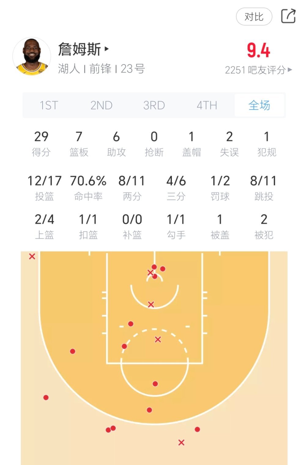 詹姆斯今日对阵76人表现:全场比赛出战34分钟,17投12中,三分球6中4,得到赛季新高29分7板6助。关键时刻连续得分稳住局势,最后时刻抢断对手杀死比赛!湖人vs76人