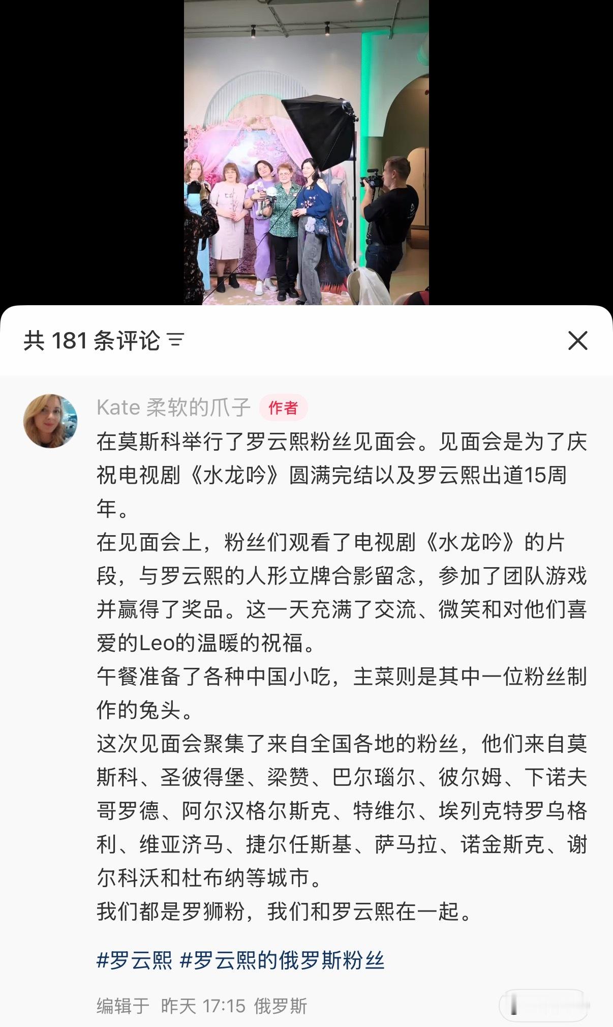 罗云熙莫斯科粉丝庆祝《水龙吟》完结和出道15周年。