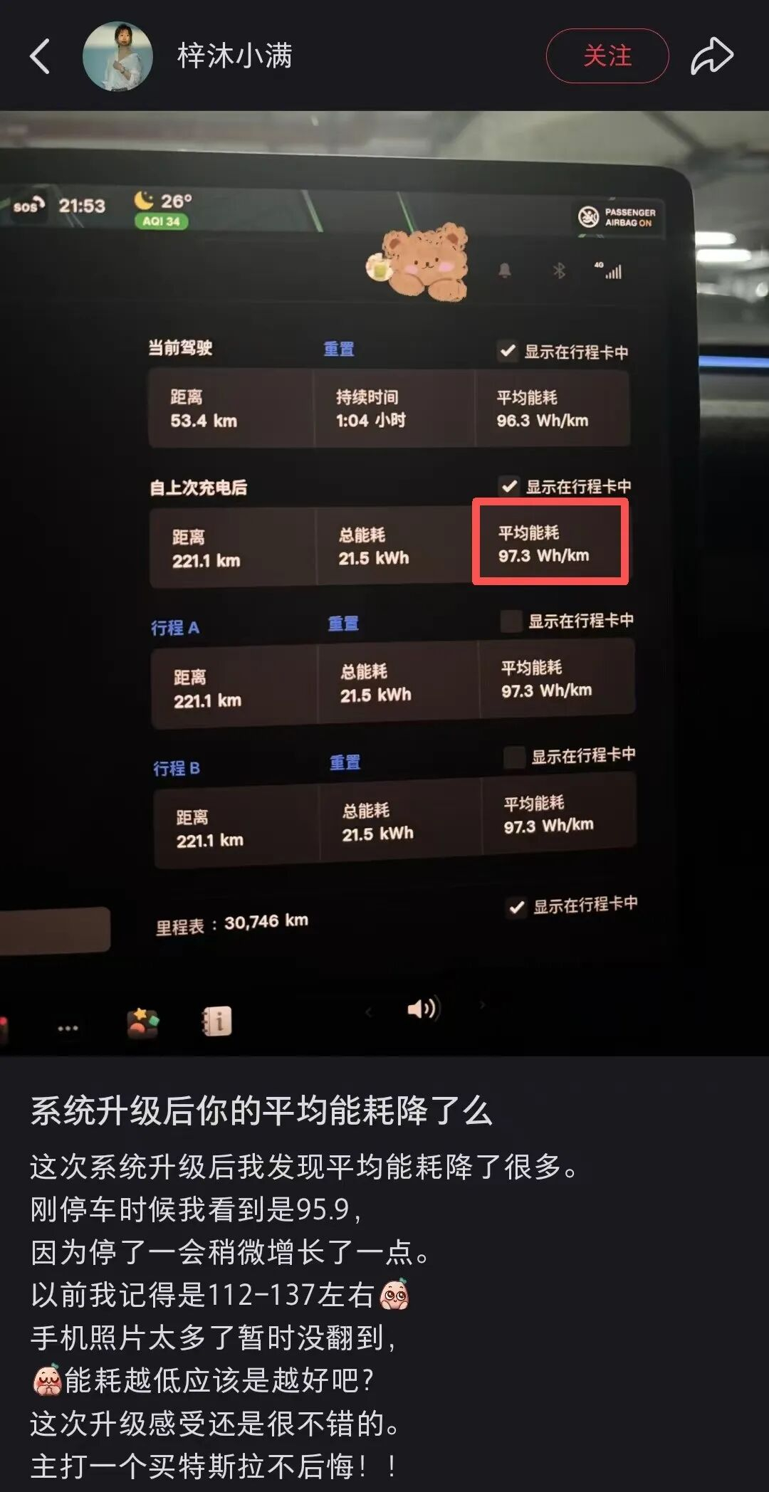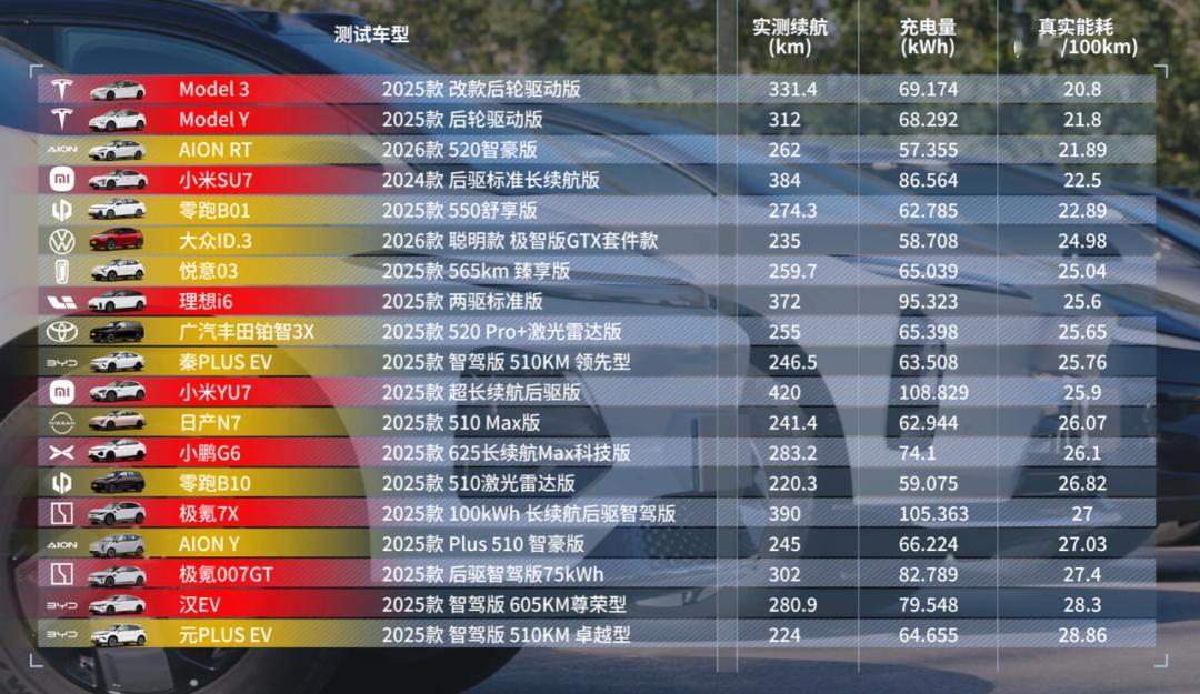 国内汽车媒体懂车帝针对市场上热门的 21 款纯电车型,开展了一场“高环极限测试”。测试结果显示,Model 3和Model Y凭借优秀的能效管理,包揽了能耗最低的车型冠亚军。据了解,本次测试旨在模拟消费者全家出行的高速场景,测试地点为北京,气温仅为 10 度,车辆需满载 375 公斤,并将空调设定为24度自动风,且能量回收制动等级均调至最低。为了获取更准确的数据,懂车帝制定了一套“真实电耗计算法”:即车辆的真实充电量÷真实续航里程=平均电耗。这种计算方式直观反映了车辆在极限工况下的真实能耗。实测数据显示,Model 3与Model Y分别以20.8kWh/100km和21.8kWh/100km的成绩,位列能耗榜冠亚军。不仅如此,Model 3与Model Y搭载的是全场容量最小的电池组,却实现了全场前三的续航达成率。这意味着,出色的电控水平让特斯拉每一度电更出活、跑得更远。评测人士总结道:“真正的能耗优化在算法,不在堆砌电池。三电系统、热管理以及车身轻量化才是一辆纯电动车的核心实力。”特斯拉的车辆工程副总裁Lars以及工程师团队在此前的媒体采访中表示,盲目增大电池容量不仅会显著增加整车重量、提高能耗,还会推高成本并延长充电时间。因此,优化整车能耗管理才是提升续航的关键。为了追求更极致的电耗表现,特斯拉的工程师们甚至将能耗管理细化到毫瓦级别,从低压电路到热管理系统,不放过任何一个可能优化能耗的细节。正是凭借这种对细节近乎苛刻的追求,才让特斯拉能够在更小的电池容量下,跑出更远的续航里程,为消费者带来更低的用车成本。标杆级三电技术带来的优势,直接体现在用户的每一次出行中。从车主梓沐小满分享的图片中可以看到,她的 Model 3平均能耗低至97.3 Wh/km,这意味着1度电可行驶约10.3公里。高效的行驶表现,让车主频频感叹:“购买特斯拉是我最正确的选择!”特斯拉 新能源汽车 汽车资讯