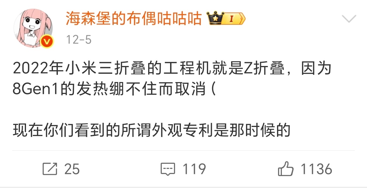 笑死~竟然还能这么带节奏,那么我可以告诉你抢注外观专利不代表就一定有实力我都不想怼你,这就是认知问题的典型了,我来给你科普一下三折叠的前世今生吧首先小米是与2022年申请了三折叠部分外观专利,其中确实有Z字形,那么小米为什么会突然在2022年抢先申请三折叠这个专利呢?这事儿的前因就是因为华为在2019年的时候启动了三折叠屏技术的国际专利申请布局,其中包括了机械结构、显示优化和用户体验等相关专利申请,同时华为还在2019年申请了一项“用于电子设备的可折叠组件”发明专利,这个发明专利就是三折叠的基础机械设计。同年,华为还提交了“可折叠电子设备”的同案申请。还有就是2019年的时候,华为还申请了三折叠相关的铰链技术、屏幕显示技术、交互技术、卫星通信技术等,这些都是属于发明和技术性专利技术。在2022年之前,小米几乎没有什么完善的折叠屏技术和发明专利这些,但是却突然申请了Z字形结构的相关专利,但是因为并没有更多的技术积累,所以只是申请了外观专利。小米的外观专利申请日期是2022年12月21日授权公告号为CN308817132S,仅仅只比华为早了两个月左右,这就不知道是为啥这么巧了华为三折叠外观专利是于2023年2月21日申请,其中就包括详细的折叠态和相关描述。从我说的这些时间点来看,华为是先做了各种技术研发和覆盖之后,才开始准备着手外观的申请,而外观部分申请对于华为这种有技术的公司来说并不会作为重点抢注,毕竟内核才是最重要的,外观不管怎么被抢,也不可能完全封死,所以这个根本不怕被谁抢先。科技数码三折叠手机