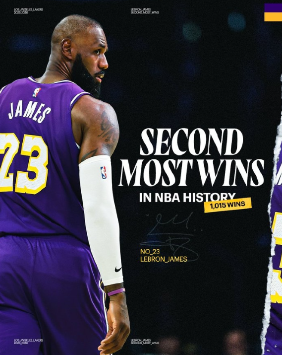 战胜76人后,詹姆斯生涯常规赛胜场数来到1015场,独居历史第二。湖人官方晒图祝