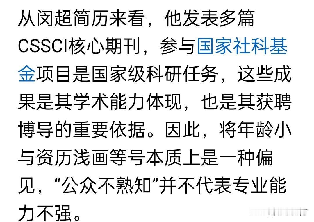 这两天26岁的浙江大学新晋博导闵超引起了大家的注意,有人赞叹,有人支持,也有人质疑其是否能名符其实。大家的各种态度其实也可以理解,一般人看到反常的事总会有些好奇,何况前两天江科大郭博导学术造假的新闻热度刚退,大家有些相关联想也算情有可原。不过质疑贴基本是只表达了怀疑的观点,却没什么合理的论证,自然也就不太有说服力。反观支持的一方,大都提到了闵超在顶级期刊发表过多篇论文,且参加国家级科研项目,这就很关键。美中不足的是毕竟是学术领域,大家虽然都知道马哲很牛,但只能是外行看热闹,看不出到底牛在哪里。如果有行内人能绐个解说,比如说论文填补了什么空缺,解决了哪个瓶颈,完善了某个体系之类的介绍,那就再好不过了。[作揖]