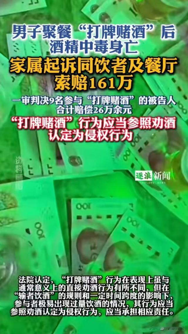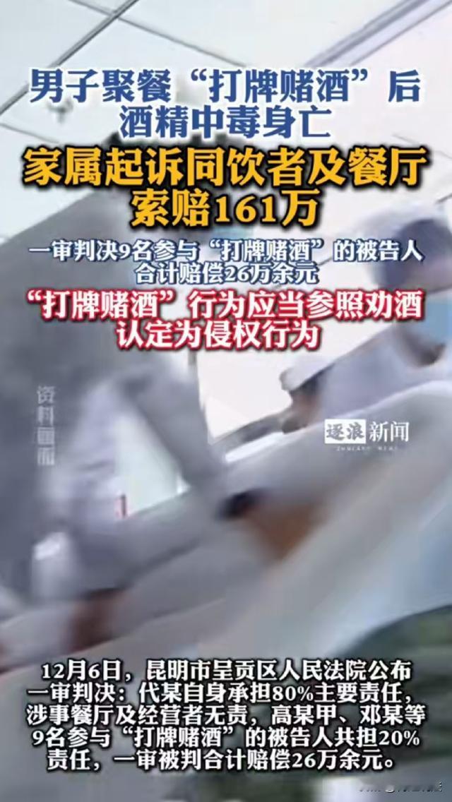云南昆明,高某的战友去昆明玩,高某做东请客吃饭,席间几人玩起了纸牌,输了的人罚喝酒,谁知其中一男子代某因急性酒精中毒死 了。案发后,代某家属起诉一同打牌喝酒的10人、餐厅经营者及餐厅,共计12个被告,要求他们共同赔偿161万余元。 据红星新闻、逐浪新闻报道,高某准备在一农贸市场开个餐馆,于是找了几个人给饭店做漆。 2024年10月2日,高某的战友去昆明玩,高某得知后兴奋万分,便组织家庭成员一起聚餐,共同迎接战友的到来,吃饭地点就定在他开店的那个市场里的一家烤鱼城。 傍晚5点左右,高某路过店面时,顺道去看了一下装修进度,高某见代某和其他两个工人正在干活,就招呼他们晚上一起吃饭。 17点50分左右,参与聚餐的人相继到场,男女老少加起来有差不多20人。 于是,高某将妇女小孩单独安排了一桌,高某带着一众能喝酒的男人另开了一桌。 饭间,男人这一桌开始打纸牌游戏,谁输了就按照规则罚喝酒。 一群人越喝越高兴,一顿饭从六点钟左右开始,直到九点还没结束。 当天晚上9点5分,给高某做漆的工人代某突然呕吐,桌上众人都以为他喝多了,并没有放在心上。 15分,代某突然从座位上往后仰了过去摔倒在地上,此时,众人都仍没意识到代某情况不对。 9点半左右,众人决定散场,此时代某意识不清无法站立,大家仍以为他酒量浅喝多了,将他扶到烧烤城门口。 后来,高某和另外两个做漆的工人一起将代某扶到他的车后座坐下,高某返回烧烤城门口和朋友打了个招呼离开,代某的两个工友留在其车旁。 一个小时后,代某的朋友接到电话,驾车前往烧烤城停车场,将车子停在代某的车后。 朋友下车后,发现代某的两个工友站在车旁吵架,代某脸朝下趴在车旁的地面上。 朋友将两个工友拉开,后在其中一人的帮助下将代某抬到后座躺下。 将代某抬上车后,朋友突然发现代某呼吸微弱,情况看起来不太对,朋友使劲摇晃代某并呼喊他的名字,但代某一直没有转醒。 10点45分,朋友在两个工友的陪同下,开车将代某送去抢救。10点55分,代某经抢救无效离世。后经鉴定,代某系乙醇急性中毒而 亡。 案发后,代某的家属将和代某一桌吃饭的10人、饭店实际经营者和饭店一同起诉了,要求他们共同赔偿161万余元。 经审理认为: 1、首先,代某作为完全民事行为能力人,应该知道自身酒量,并尽到相应注意义务。 《民法典》第一千一百七十三条规定,被侵权人对同一损害的发生或者扩大有过错的,可以减轻侵权人的责任。 代某应当对自己的饮酒量和身体状况有清晰认知,具备控制饮酒行为的能力。 他在“打牌赌酒”活动中,未能合理把控自己的饮酒量,导致过量饮酒并最终因乙醇急性中毒死 亡。 所以,代某自身对损害结果的发生存在主要过错。 2、其次,烤鱼城及经营者不应承担责任。 餐厅老板作为经营餐饮服务的市场主体,容留服务消费者在其经营场所饮酒属于正常的市场行为。 依据《民法典》第一千一百六十五条规定,行为人因过错侵害他人民事权益造成损害的,应当承担侵权责任。 餐厅及其经营者在提供餐饮服务过程中,并无过错行为。 聚餐结束后,代某由他人搀扶离开餐厅,后上了他停在停车场的车。此时,代某已经脱离了餐厅的管理范围。 餐厅的安全保障义务主要针对其经营场所内的消费者,对于饮酒后已经离开经营场所的代某,餐厅及其经营者不再具有安全管理义务。 因此,代某家属要求餐厅及其实际经营者承担责任,既无事实依据,也无法律依据。 3、同饮者应根据各自的错过程度分别承担责任。 吃饭时间,10名同饮者均参与了打牌赌酒游戏,这种游戏在表现形式上与常见的直接劝酒行为有所不同,但在游戏规则和游戏时间跨度的影响下,参与者很容易出现过量饮酒的情况。 根据《民法典》第一千一百六十五条,这种行为应当参照劝酒认定为侵权行为。 同饮者通过组织打牌赌酒游戏活动,对代某的过量饮酒起到了一定的推动作用,存在一定过错,所以应当承担相应责任。 10名同饮者中,卢某不能饮酒,因此并没有参与打牌和喝酒,但在吃饭期间,卢某一直担任给其他人倒酒的工作,是这一游戏规则的执行者。 因此,卢某对游戏的顺利进行起到了协助作用,具有一定过错,同样应依据《民法典》承担相应责任。 另外,同桌10人中有一人未参与游戏,且提前离开,其不存在侵权行为,不应承担责任。 最终,经核定,代某离世造成的各项损失共计1289823.53元。 一审判餐厅及其实际经营者无需承担责任。聚会组织者高某承担5%责任,赔偿代某家属66991.18元。 其余8人根据各自过错程度,分别承担1%到3%责任,各自赔偿13398.24元、26796.47元、40194.71元不等。 另外,同饮者9人共同赔偿代某家属精神损失费10000元。
