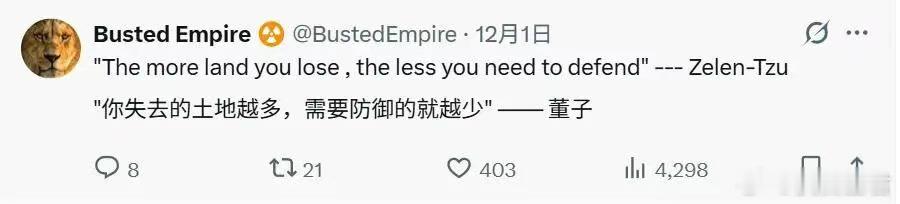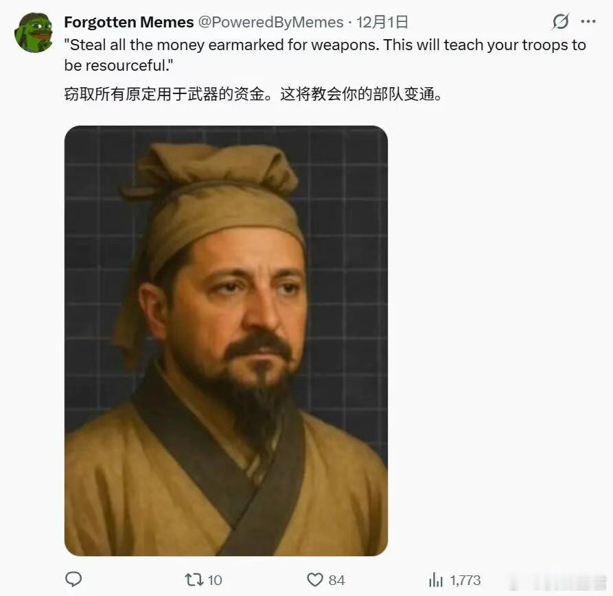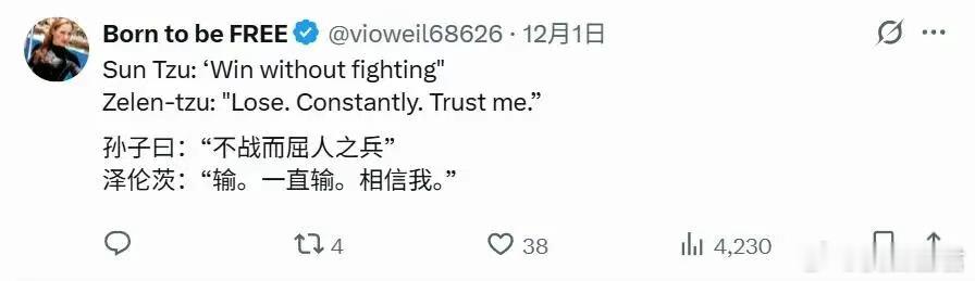 外网恶搞泽子兵法:百战百胜非善也,不胜而屈人之兵,善之善者也川普强推俄乌停火“和平计划”,外国网民纷纷恶搞《泽子兵法》:百战百胜,非善也;不胜而屈人之兵,善之善者也。身为一个中国人,不管你有没有读过《孙子兵法》,这段话你大概率应该都听过:“百战百胜,非善之善者也;不战而屈人之兵,善之善者也”。这话出自《孙子兵法·谋攻篇》,意思是:百战百胜固然好,但这还不是好中之好;不打仗就能使敌人屈服,这才是最好的。孙子在西方本身就非常受欢迎,而他和他的理论又属于老外在写小作文时都特别爱用的“名人名言”,所以知道这段话的老外也不在少数。这两天国外上有个网民用孙子的这句名言仿写了一部《泽子兵法》,在X上大受欢迎,浏览热度超过21万,评、转、赞各有275条、1278次和7865个。他的原话翻译过来,意思大概是:“赢得一场战争最好的方法,是每场战斗都输。你的敌人赢多了就麻了,最后就会对战争感到厌倦”——《泽子兵法》,弗拉基米尔·泽连斯基·子。如果把这话换一种文言文的形式表达出来,那我想它大概就是这样的:“夫战之道,不胜以为胜。每阵皆北,则敌骄而惰。久暴师则锐气挫,数告捷则心神疲。此谓以败为胜之法。”因为这个胡说八道的段子乍听之下好像还有那么几分歪理,所以好多老外的创作热情都被激发了出来,在评论里开启了疯狂的二创大赛:“泽子云:你失去的土地越多,需要防守的漏洞就越少。”“泽子云:如果你的对手赢得不够快,那最后赢的就是你。”“泽子云:把原本应该用来买武器的公款挪用到别的地方,这样会迫使你的部队学会变通。”“孙子云:不战而屈人之兵,善之善者也;泽子云:你懂个屁?输,一直输,输多了自然就赢了,你信我。”还有人搬出了当年恶搞拜登的段子,套用在如今泽连斯基的头上:“乔子曾云:如果连你都不知道你自己在干嘛,那你的敌人肯定也会晕头转向。”为什么这帮老外要在这个时间点上疯狂玩泽连斯基的梗?因为川普是真的准备好要把乌克兰和小泽给卖了。根据《时代周刊》等外媒最近透露出来的风声,现在的俄乌冲突的局面是这样的:俄军在顿巴斯高歌猛进,波克罗夫斯克眼看就要守不住了,甚至还有视频流出,普京都跑到前线指挥所去视察了。换做正常思路,乌克兰面临的这个局面应该叫兵败如山倒。但在《泽子兵法》的逻辑里,这个却叫“战略性让地”。面对前线大片领土的实控权易手,小泽在巴黎见马克龙的时候还在强调,领土问题是“最困难”的。为什么困难?因为承认失败很难,但要把“失败”包装成“还没输”,那就更难了。如果说战场上的失地还只是为了“疲敌”,那么在后勤补给上,外网上的乐子人则又给《泽子兵法》补充了新的一章:“泽子云:把原本用来买武器的钱都揣进自己腰包。这能极大地锻炼你部队在战场上的主观能动性和资源搜集能力。”更地狱的是,这个段子还不只是个段子。有关注俄乌局势的人应该都知道,基辅最近发生了一件大事:小泽最信任的幕僚长叶尔马克,一直负责俄乌谈判的核心人物,突然辞职了。原因很劲爆:反腐调查人员直接抄了他的家。紧接着,泽连斯基内阁的两位部长也被炒了鱿鱼。眼看乌克兰那头冒出来了这么大一个瓜,搞得就连远在空军一号上的川普都忍不住对此发表了高论:“我觉得泽连斯基他可能遭遇了一些小困难。”(difficult little problems)而这正好印证了《泽子兵法》里的另一条核心奥义:只要我输得够快,西方援助的账目就越难查清;只要局势越乱,浑水摸鱼的机会就越多。更有意思的是,还有外国网民分析,这种乌克兰当局的这种贪腐现状,或许也是一种深谋远虑:通过不断的战损和混乱,让那些西方金主产生一种沉没成本的焦虑。“你们也不想你们的钱都打水漂对吧?那就继续投钱咯。”现在被摆在谈判桌上的那份由美方起草的所谓“和平计划”,对小泽而言与其说是说是“和谈书”,倒不如说更像一份“清算单”。俄军占领的顿巴斯地区,乌克兰大概率是要不回来了。虽然小泽嘴上还在说“绝不割让”,但实际上很可能不得不接受现状。至于小泽心心念念的加入北约,那就更不用想了。因为普京坚决反对,川普也意兴阑珊。欧洲人还在那儿玩文字游戏,搞了个什么“欧洲反提案”,实际上就是在委婉地告诉乌克兰:“哥们骗骗别人就把,别把自己也给骗了。”面对这种局面,又有网民给《泽子兵法》补充了一条新的理论:“泽子云:最高级的领导艺术,就是把自己绊倒了,撞在敌人身上,然后宣布这是一次完美的肩撞。如果敌人把你推倒在地,那你就应该躺在地上发表长篇演说,控诉他们野蛮的武力。”现在明明乌克兰在前线打不过了,被迫要签城下之盟,但在公关口径上,基辅还必须将其称为“有尊严的结束战争”。《时代周刊》甚至还为此找补,说虽然目前的“和平计划”是“痛苦的让步”,但相比俄罗斯最初想吞并整个乌克兰的目标,这高低也算是一种“有保留的乌克兰式胜利了”。这就是西方新闻学和定义学的艺术。只要我把标准定得足够低,就没有什么是不能赢的。虽然国外乐子人恶搞的《泽子兵法》全是瞎编的段子,但一个令小泽感到无比尴尬的现实是:目前俄乌的局势,恐怕要比远比段子里调侃的那些地狱笑话更加残酷。乌克兰现在所有的博弈筹码,已经只剩下最后一点了。哪一点?说白了就是一个字:耗。乌克