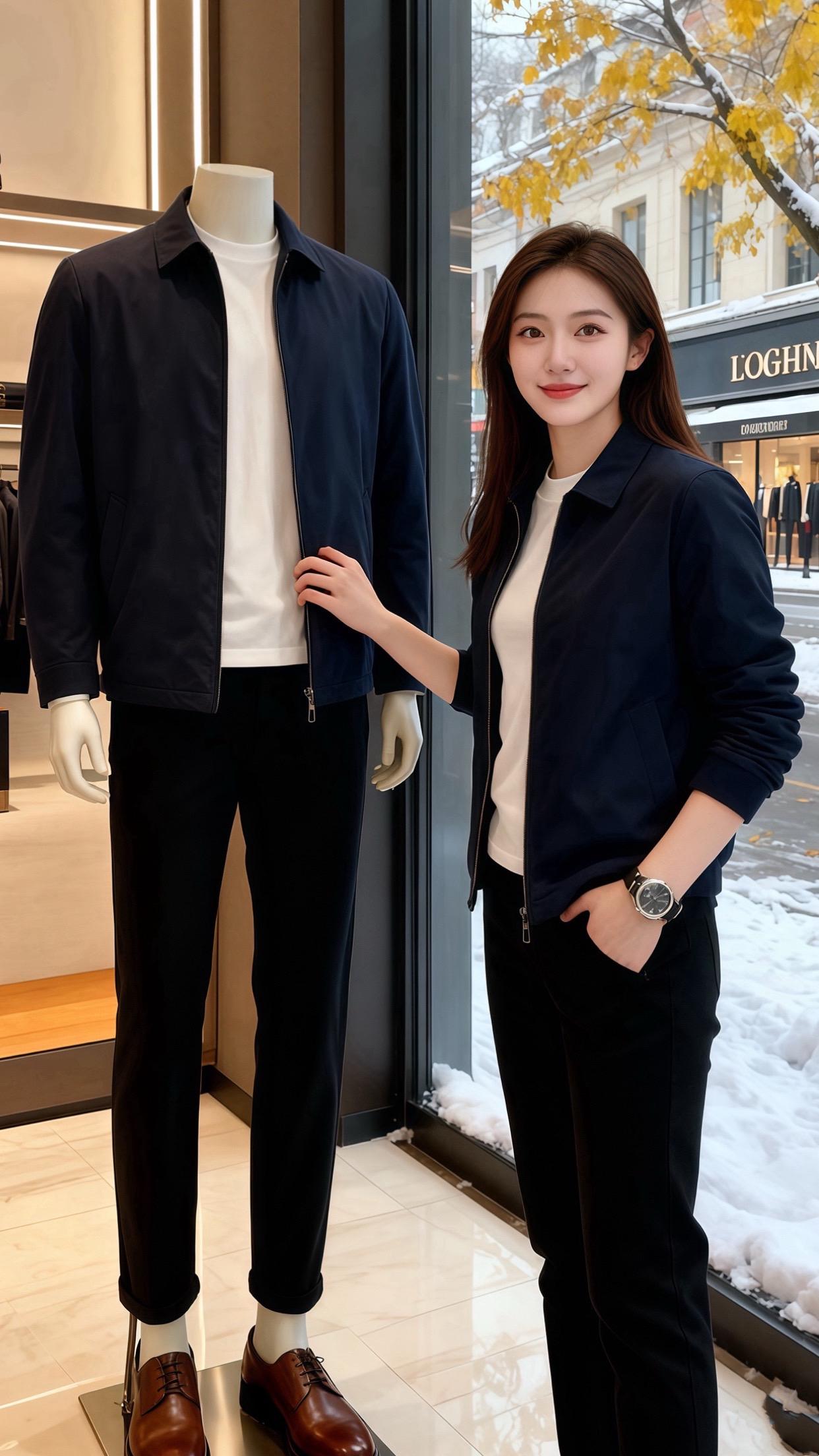 雪粒扑在男装店橱窗时,许妍正指尖碰着藏青外套的拉链——和她身上这件翻领款一模一样,冷调的藏青裹着肩线,衬得内搭的白T恤像落了点软光。