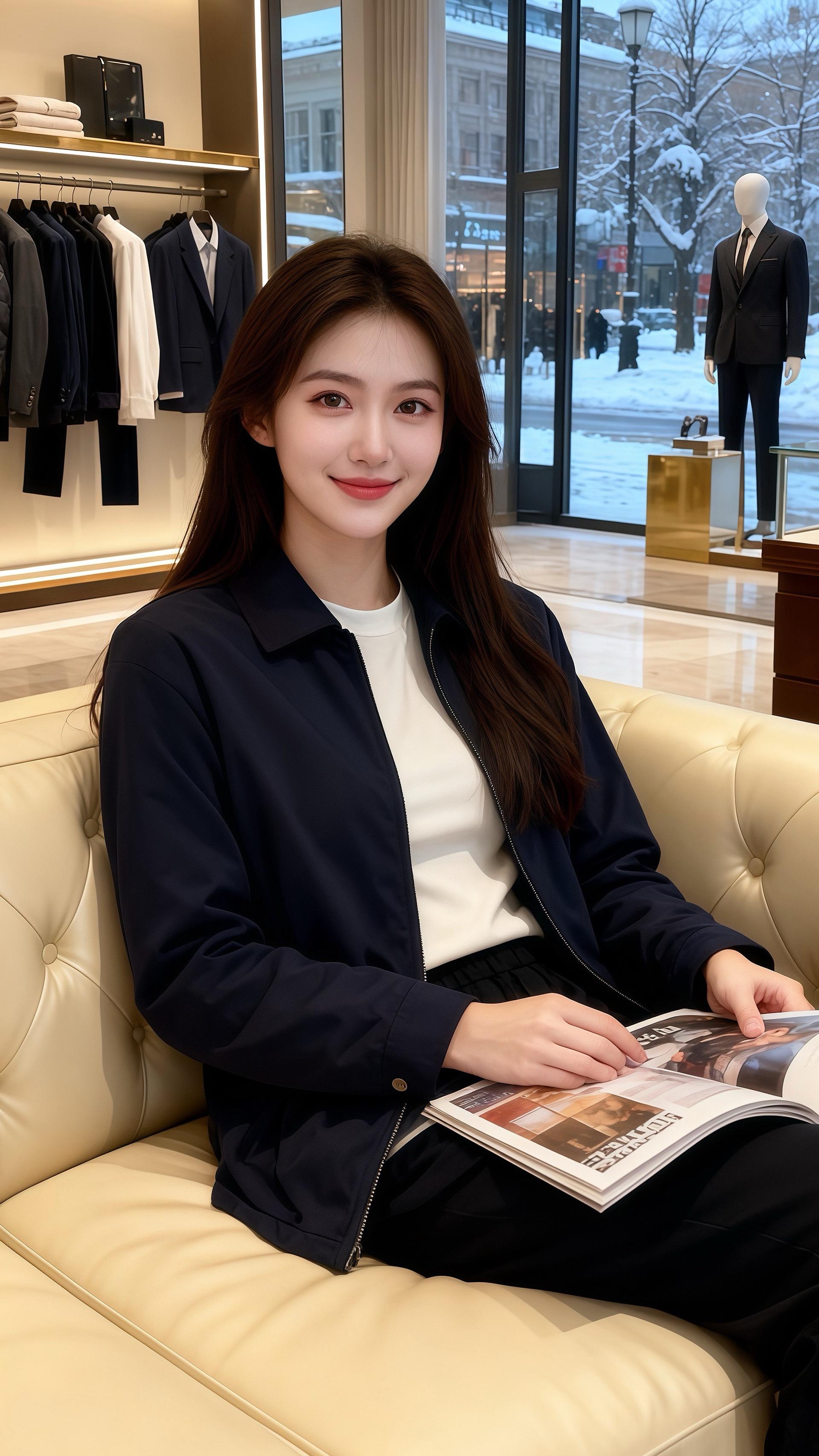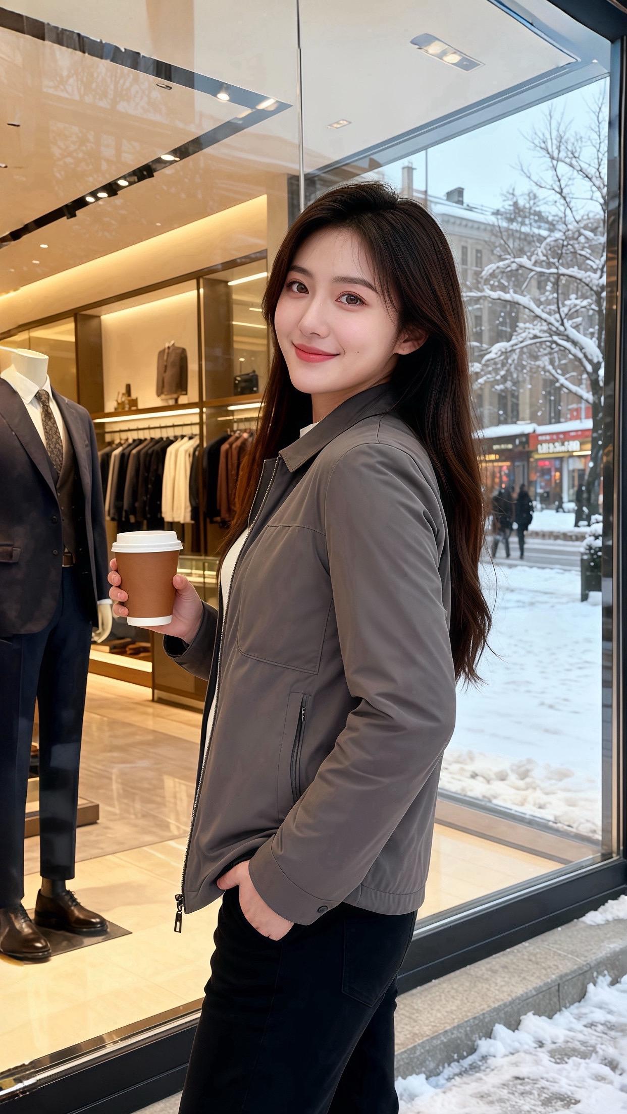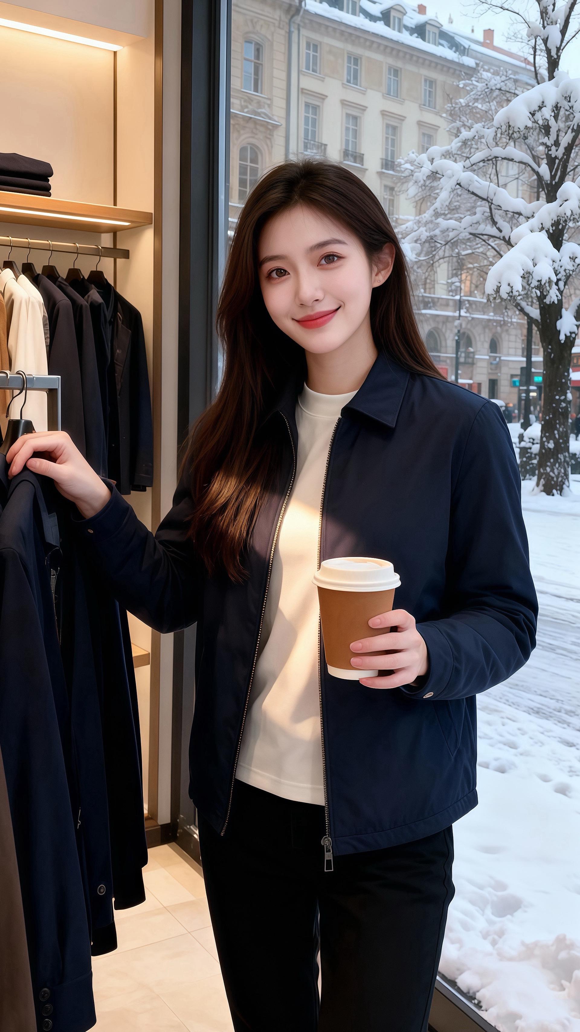 皓明拎着热拿铁走近,围巾还沾着细雪,视线先黏在她身上:“这外套穿在你身上,比挂在架上有味道多了。翻领的弧度衬得肩线很舒展,比模特穿得多了点松弛的好看。”