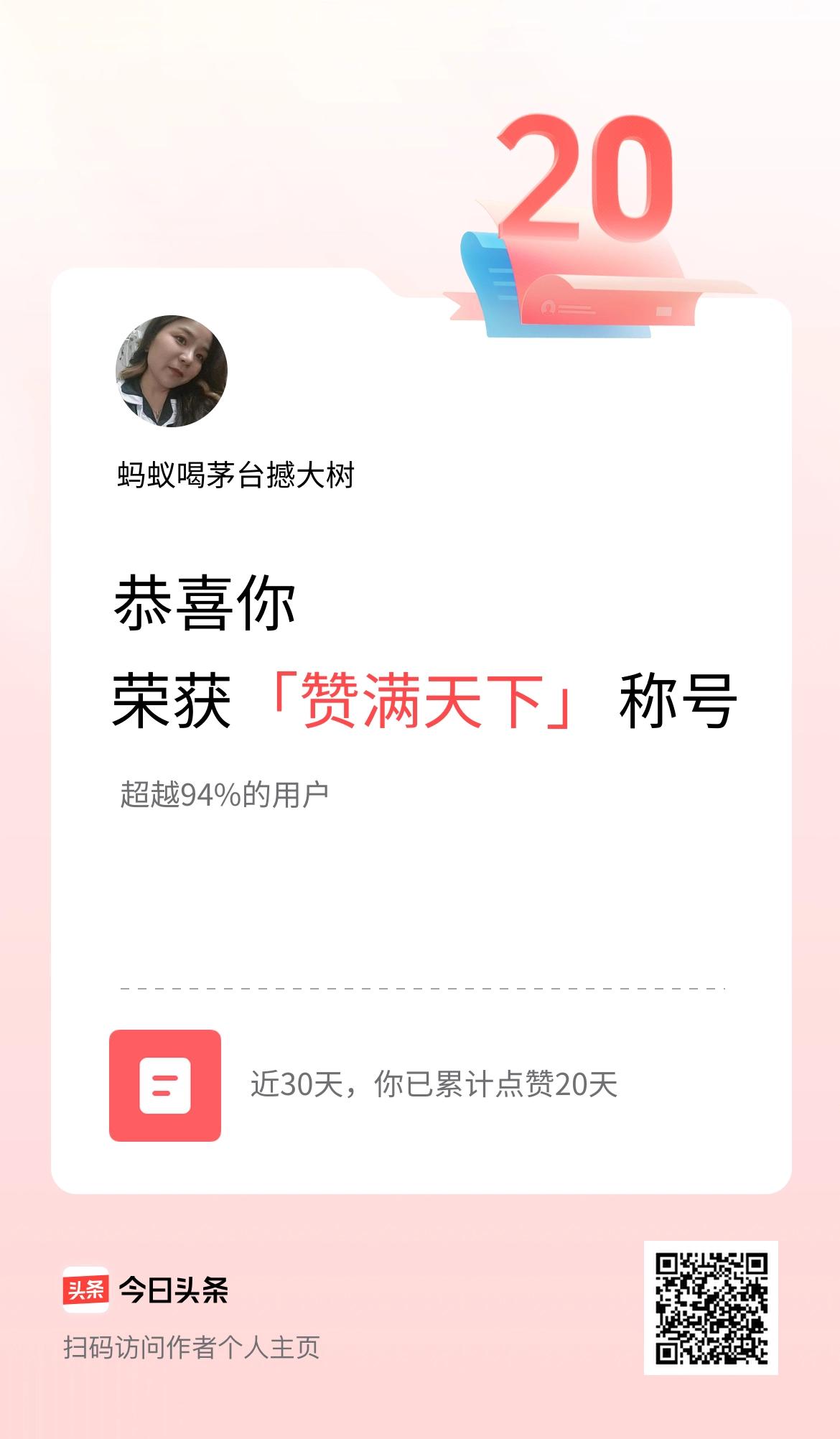 我在头条30天内点赞打卡20天,获得“赞满天下”称号