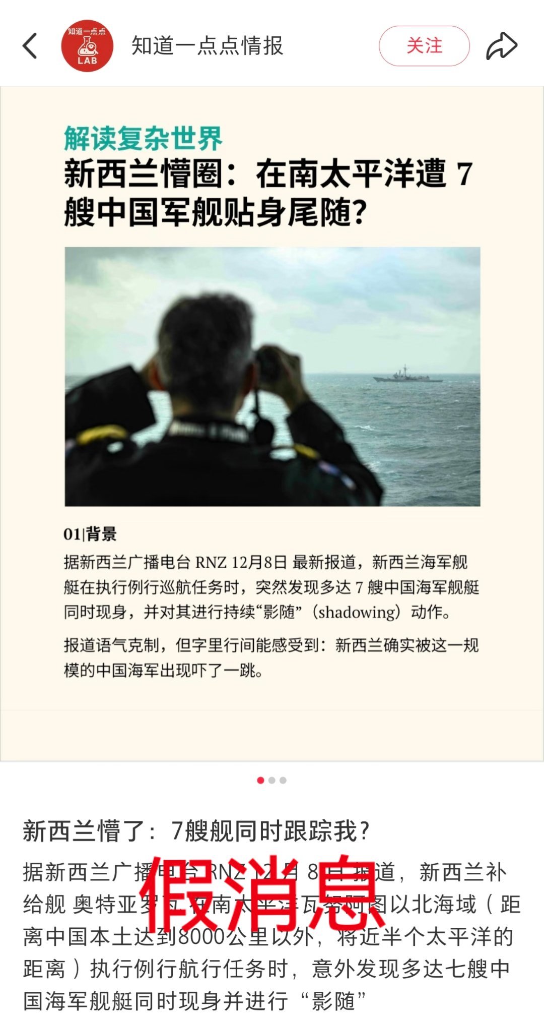 真假参半的假消息——的确有这个报道,但是说的是新西兰军舰在东亚航行期间遭东大7艘舰艇跟踪(而且大概率是偶遇),并非是中国海军舰艇出现在瓦努阿图以北,因此这个就是在真的报道上自己脑补发挥的假消息,注意分辨。热点观点