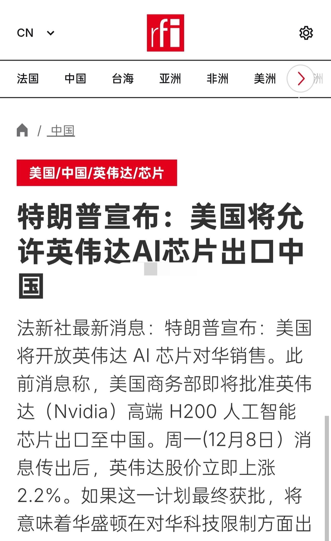 外媒消息:英伟达获许对华出售H200芯片! 据彭博社报道,美国总统特朗普已批准英伟达向中国出口其H200 AI芯片,前提是美国政府能从销售额中抽取25%的分成。特朗普在其真相社交上公布了这一决定。他还表示,销售将仅面向“获批准的客户”,包括英特尔、AMD在内的其他芯片制造商也有资格获得许可对华出售芯片。 H200是英伟达面向全球数据中心的旗舰级AI GPU,性能优于上一代H100,且远超目前美国允许对华出口的降规版H20芯片。 对中国的科技企业而言,引入H200芯片将有力推动人工智能、大数据等领域的发展。高性能芯片可加快计算速度,提升研发效率,使相关技术更快落地应用。一些专注人工智能研究的企业,有望凭借H200芯片突破技术瓶颈,开发出更先进的算法和模型。 当然,尽管引入H200芯片带来了发展机遇,但绝不能因此懈怠自主研发。核心技术无法购买和借用,只有坚定地走自主创新之路,才能真正摆脱对国外技术的依赖,在全球科技竞争中掌握主动。未来,中国科技企业仍需加大在芯片研发等关键领域的投入,培养高端人才,提升自主创新能力,为我国科技产业的长远发展筑牢根基。