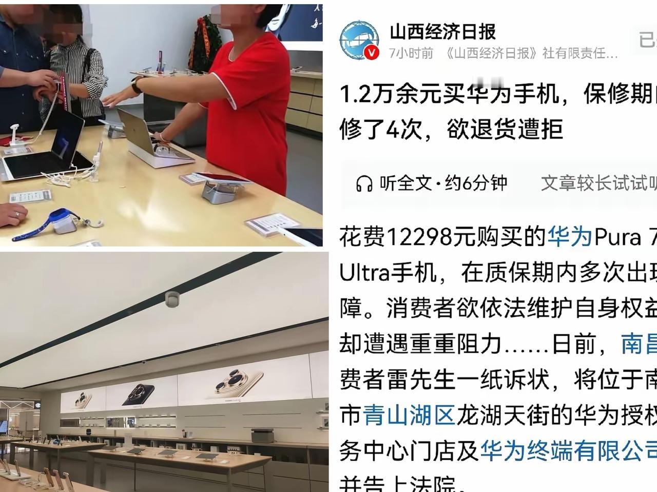 江西南昌,男子花12298元买了一部华为手机,使用一年后,手机出现卡顿、死机、暗屏多个问题。男子将手机送到服务中心维修,取回后 发现原有问题没解决,手机后盖又出现密封不严,维修人员说需返厂处理,之后,手机经过4次维修,始终没解决问题。 男子对品牌失去信心,质保期内要求退换机,被拒后,将对方告上法庭,要求赔偿12298元购机款,以及精神损失费1元。而最终的结局,令所有人意想不到! 2024年4月19日,雷先生在某华为授权服务中心,买了一部华为Pura 70 Ultra手机,价格是12298元,保质期为2年。 刚用满一年,手机就突然掉链子,卡顿、死机、暗屏三大问题齐上阵,根本没法正常使用。 2025年4月20日,雷先生赶紧把手机送到当初购买的授权服务中心,维修主管检查后说主板出了问题,需要等配件更换。 可等第二天取机时,雷先生傻了眼:维修单上写着“参数调整+保养”,手机原有的故障一个没解决,后盖反而多了个密封不严的新问题,这修了跟没修有啥区别? 四天后,雷先生只能再次送修,工作人员说后盖密封处理不了,得返厂。雷先生唯一的要求就是彻底修好,不影响使用,可等来的还是失望。 5月3号,满怀期待去取机的雷先生,特意当场试机,结果直接让维修人员下不来台:暗屏问题还在,又添了微信数据传不了的新毛病,现场所有人都尴尬得不行。 将近13000元的手机,比三四千的入门机还不耐用,修了四次不仅没好,还越修问题越多,换谁都得气炸。 雷先生彻底失去信心,既然还在两年质保期内,他提出退换机,却被店长一口拒绝。 理由离谱到让人发笑:同一故障一年内修两次才能换机,雷先生这四次都算“检测服务”,不算真正维修。 可明明是维修人员自己说要换主板,最后压根没换,才导致问题反复,这锅凭啥让消费者背? 很多人遇到这种事可能就认栽了,觉得维权太麻烦,但雷先生偏不,他直接把授权服务中心告上法庭,要求退还12298元购机款,再加1元精神损失费。 这1块钱,不是为了钱,而是为了争口气,讨个公道。其实雷先生的维权底气,完全有法律依据。 《消费者权益保护法》第24条明确规定,商品不符合质量要求,消费者有权要求退货、更换或修理。 而《移动电话机商品修理更换退货责任规定》也提到,三包有效期内商品出现故障,销售者不能故意拖延或无理拒绝三包责任。 雷先生的手机在质保期内多次维修仍无法正常使用,已经符合法定退货条件,授权服务中心拿“同一故障维修两次”的条款当挡箭牌,根本站不住脚。 高端产品卖的不只是硬件,更是服务和保障,不能只在卖货时强调品牌价值,出了问题就拿条条框框敷衍消费者。 让人没想到的是,法院刚立案,华为方就主动联系雷先生和解,提出换即将上市的新款手机。但雷先生已经对品牌失去信任,坚持要求全额退款。 最终的结果大快人心:对方不仅全额退还12298元购机款,还额外给了8000元慰问金,雷先生选择撤诉。 这结局不仅是雷先生个人的胜利,更给所有消费者提了个醒:维权从来不是小题大做,你的退让只会让不良商家得寸进尺。 现在很多人遇到消费纠纷,要么觉得“多一事不如少一事”,要么怕维权成本高、耗不起,最后默默忍了。 但雷先生的经历告诉我们,消费者的合法权益不是靠商家施舍的,而是靠自己争取来的。 1块钱的精神损失费,背后是对不公待遇的反抗,是对消费公平的坚守。高端品牌更该明白,质保期不是免责期,售后服务不是摆设。 真正的品牌口碑,是在消费者遇到问题时,用真诚和负责换来的,而不是靠推诿扯皮消耗信任。 反观现实中,不少消费者遇到类似的产品质量和售后问题,要么被商家的“话术”忽悠,要么因为不懂法而放弃维权。 其实只要掌握好相关法律条款,保留好维修记录、发票等证据,维权并没有想象中那么难。 雷先生的胜诉,不仅为自己讨回了公道,也给所有消费者树立了一个好榜样:面对不合理的对待,别忍别让,拿起法律武器保护自己,才能倒逼商家重视服务质量。 你有没有遇到过消费维权的糟心事?如果是你花一万多买的手机修不好还被拒退,会选择认栽还是坚决维权?