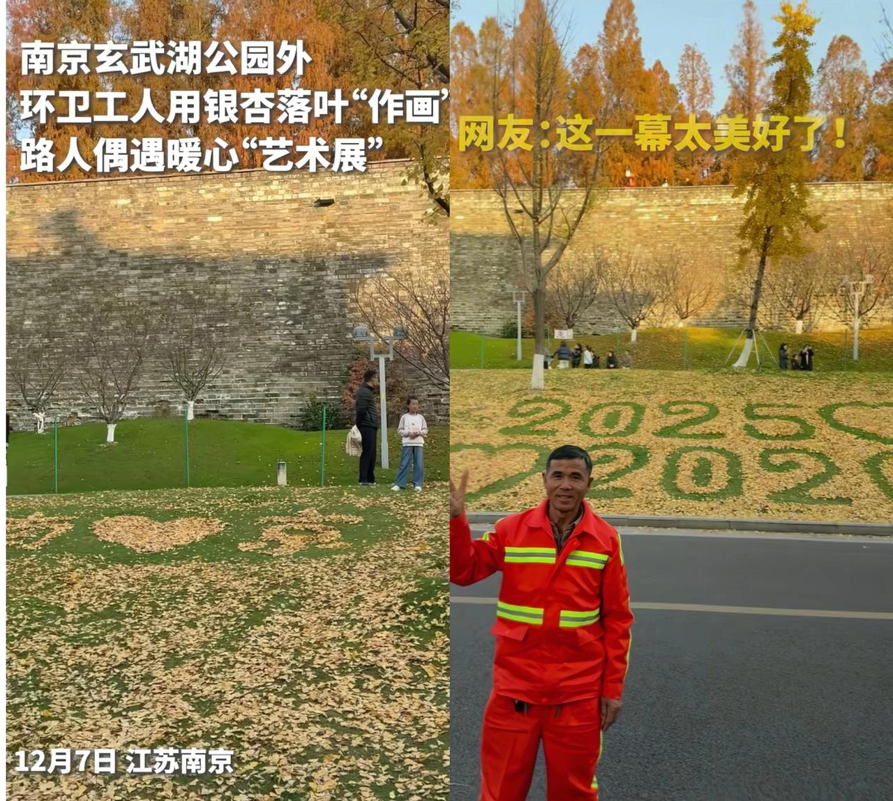 火到央视了! 江苏南京, 一位环卫大爷火了, 他看着草地上掉落的银杏叶,又看看时不时来这打卡的游客,大爷突然灵机一动,直接用树叶在地上摆出了一个造型,结果直接成为了当地一个热闹的打卡点,就连央视都忍不住点赞:南京你是懂浪漫的! 视频中,大爷没把落叶扫进垃圾袋,而是蹲下身,用手把一片片银杏叶仔细地铺在草地上。叶子在他手里不再是垃圾,倒像是拼图的碎片。他慢慢地铺,慢慢地摆,一个清晰的图案渐渐成形:““南京,2025❤️2026❤️”的图案” 路过的年轻人纷纷驻足拍照,这片草坪一下子有了温度。 网友说得没错,懂浪漫不分年龄、阶层和职业。大爷没因工作枯燥就敷衍,而是用创意和情感,赋予落叶新生命。生活的浪漫不在远方,就在日常的点滴用心里。大家身边有没有这种,用平凡创造美好的人呢,快来唠唠。南京银杏打卡点 南京银杏 环卫老大爷