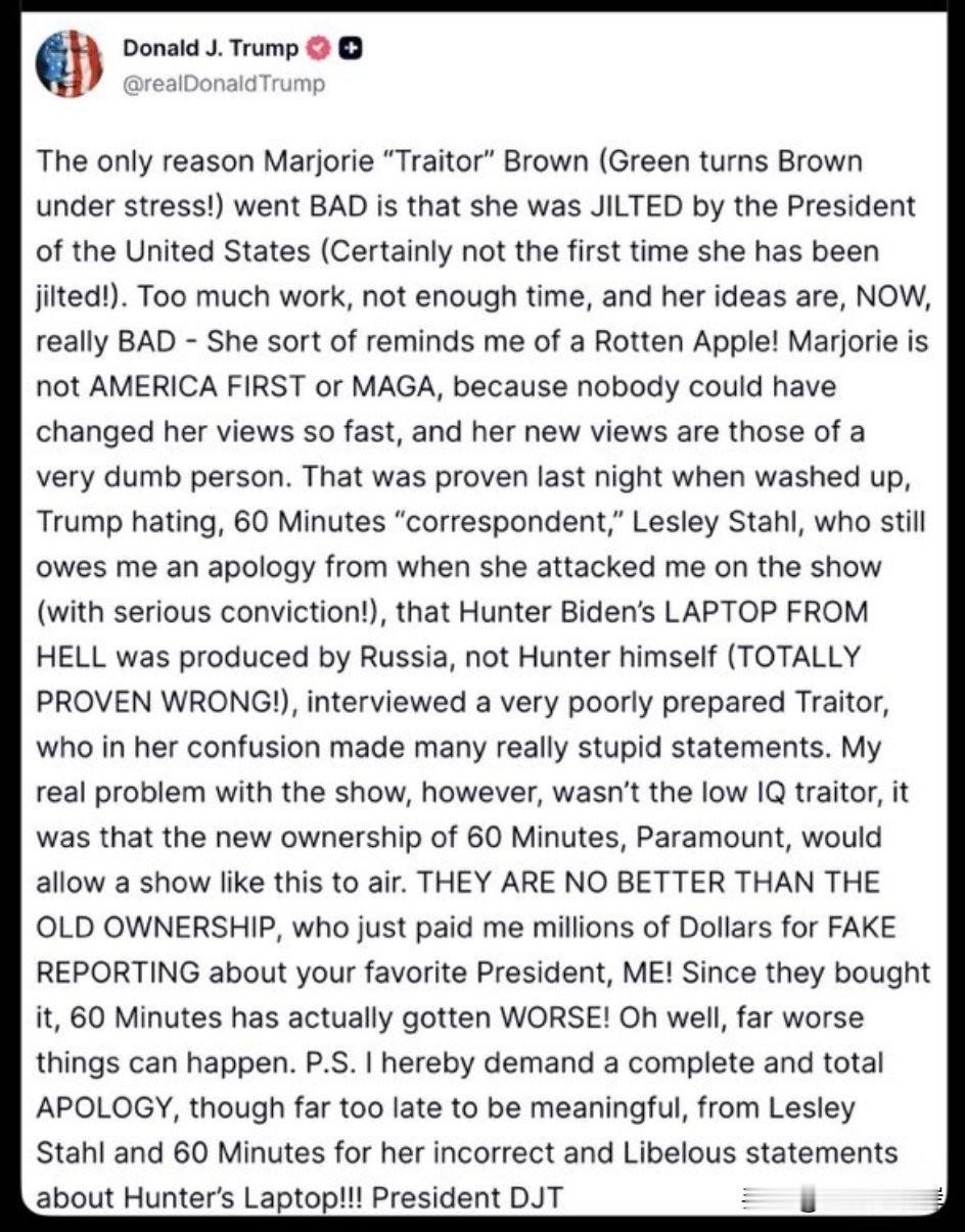 川普怒骂“叛徒”Marjorie。 “Marjorie “叛徒” Brown(Green 在压力下变成 Brown!)之所以变坏,唯一的原因是她被美国总统甩了(这当然不是她第一次被甩!)。太费劲,时间不够,她的想法现在真的很糟糕——她有点像一只烂苹果!Marjorie 不是 America First 或 MAGA,因为没有人能这么快改变立场,她的新观点就像一个非常愚蠢的人。昨晚这一点得到了证明,当那个过气的、仇恨川普的《60分钟》记者 Lesley Stahl——她至今仍欠我一个道歉,因为她在节目里攻击我(态度极其恶劣!)——声称 Hunter Biden 的“地狱笔记本”是俄罗斯搞的,而不是 Hunter 自己(已被完全证明是错的!)——采访了这个准备极差的叛徒,她在混乱中说了许多极其愚蠢的话。然而,我对这档节目真正的问题,不是这个低 IQ 的叛徒,而是《60分钟》的新东家 Paramount,竟会让这样的节目播出。他们跟旧东家一样糟糕,旧东家还因为对我的假报道赔了我数百万美元!自从他们接手后,《60分钟》反而更烂了!算了,还有更糟的事可能发生。 P.S. 我特此要求 Lesley Stahl 和《60分钟》为她们关于 Hunter 笔记本的错误和诽谤性言论做出全面道歉,虽然为时已晚,毫无意义! ”