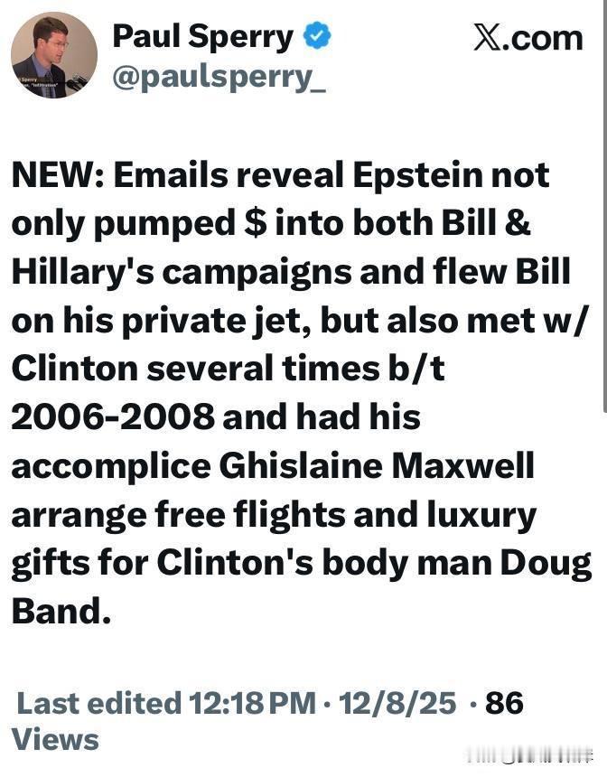 最新爆料:邮件显示,Epstein 不仅向克林顿和希拉里的竞选活动捐款,还让克林顿乘坐他的私人飞机,而且在 2006–2008 年间多次与他会面,并指使同伙 Ghislaine Maxwell 为克林顿的贴身保镖 Doug Band 安排免费航班和奢侈礼物。