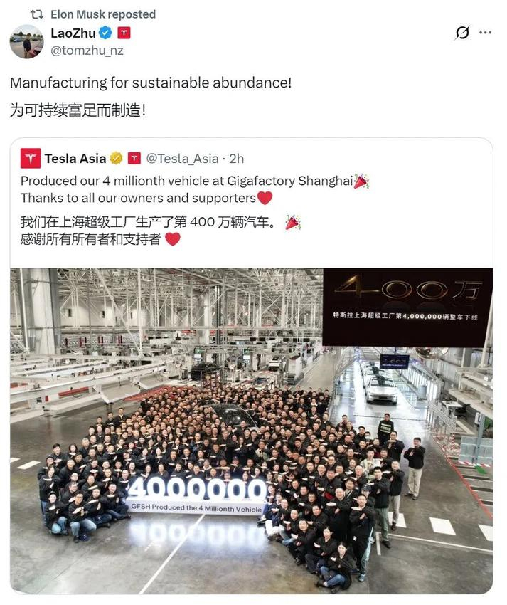 特斯拉上海工厂下线第400万辆整车:30秒一台车的标杆速度,年末交付中心全线火爆2025年12月8日,随着一辆星光金 Model Y L驶下产线,特斯拉上海超级工厂迎来了第400万辆整车下线的全新里程碑。目前,上海超级工厂已经贡献了特斯拉全球近一半的电动车交付量。作为全球最高效的整车厂,特斯拉上海超级工厂30多秒下线一台车的效率一直都是行业标杆,高效的生产制造给消费者带来了更优质的产品和更可负担的价格。随着近期Model Y L、Model Y长续航后轮驱动版的相继开启交付,无论追求经济实惠、超长续航、全能表现还是六座出行,消费者都能找到更适合自己需求的特斯拉车型。叠加5年0息等金融政策,年末的全国各地交付中心持续火爆。特斯拉中国官网显示,部分现车数量非常有限。特斯拉 欢乐购车季 新能源汽车