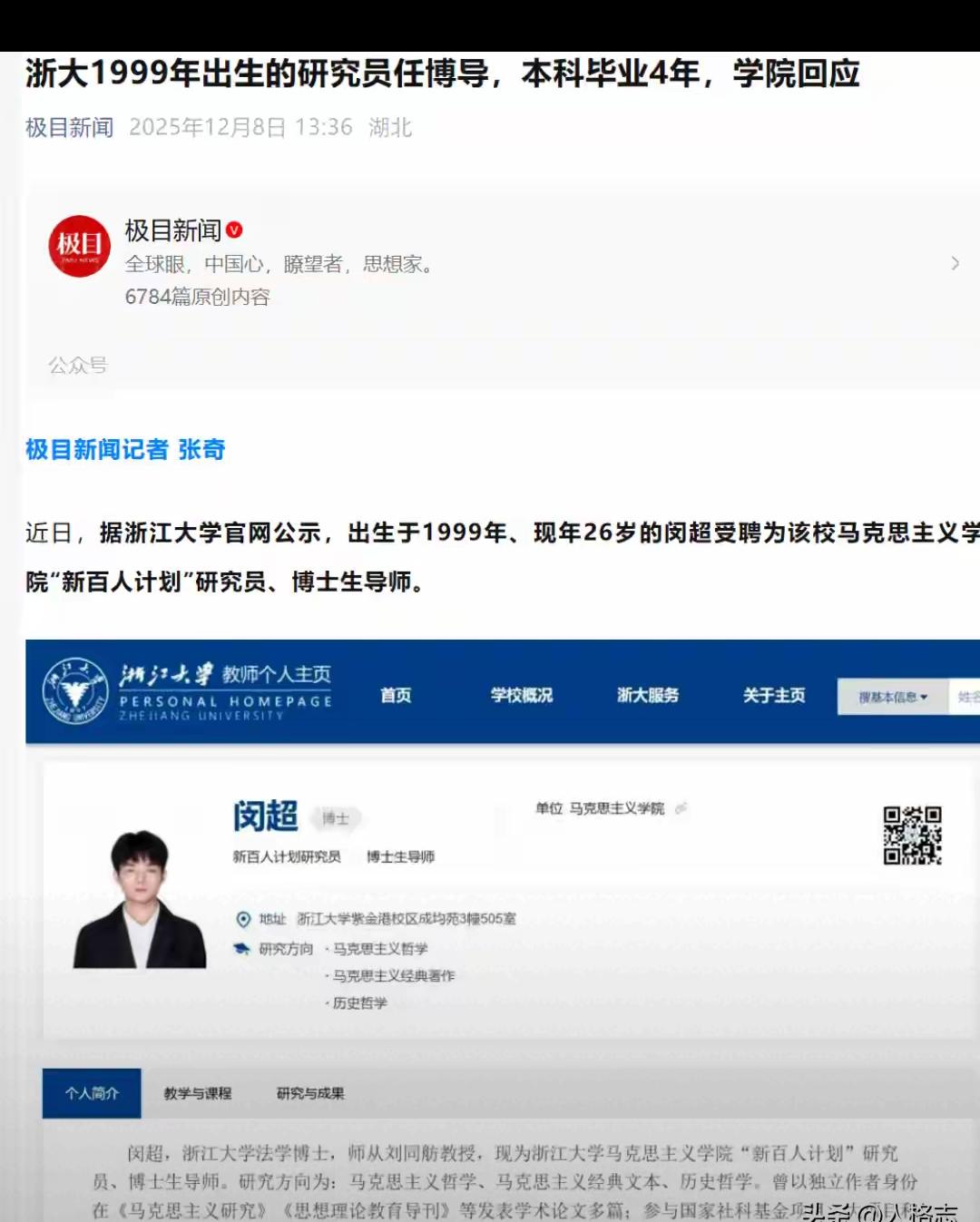 34岁韦东奕刚升副教授,26岁闵超就成浙大博导,这对比看着心里堵得慌,不是比谁优秀,是比出了学术价值的失衡感。韦神的厉害不用多说,破解数学难题,成果支撑航天船舶发展,实打实帮国家突破技术瓶颈,论文硬到国际认可,却低调熬了这么多年才晋升,日常朴素到极致,眼里只有学术,从不搞流量噱头。 闵超虽有核心论文和科研参与经历,但没什么突破性成果,26岁当博导却全网疯炒,热度远盖过韦神。其实学界该以硬核贡献论高低,韦神这类扎根基础科研、默默为国蓄力的学者,才该是焦点,他们的价值远比年龄噱头厚重。 学术不该追速成热度,沉下心做实事的人才该被高看。你觉得衡量学者价值,该看成果分量还是晋升速度?