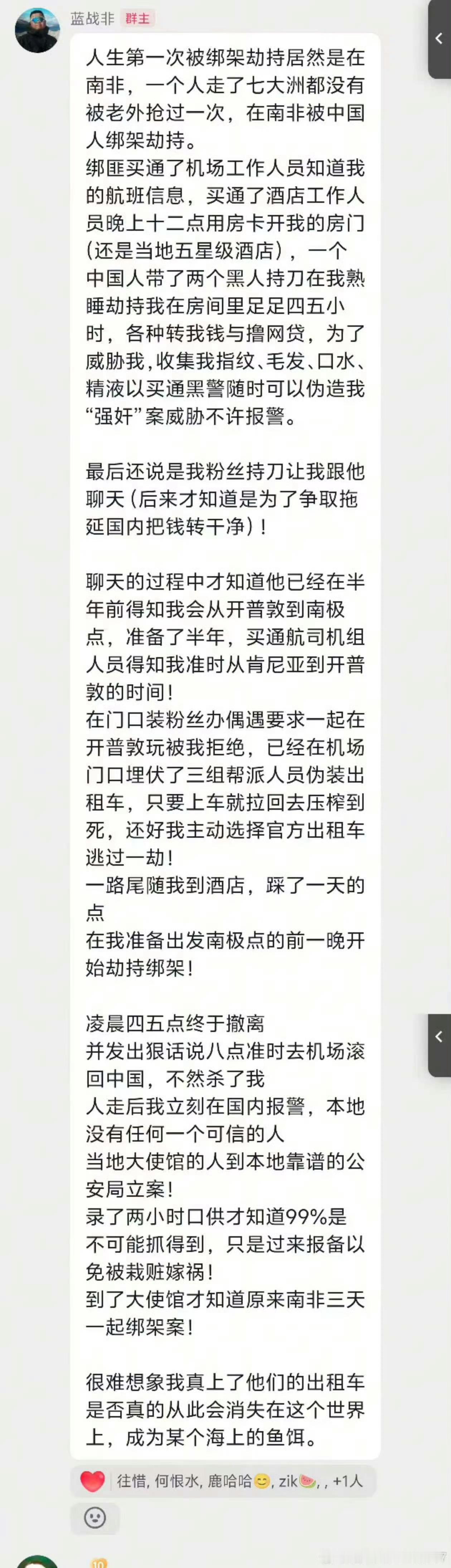 卧槽兄弟们,蓝战非被绑架…大家出门在外还是要注意人身安全啊,不能相信任何人,蓝战非在说自己在南非遭遇绑架,绑匪甚至买通了机场和五星级酒店的工作人员,提前半年就在蹲他的行程了......蓝战非被绑架