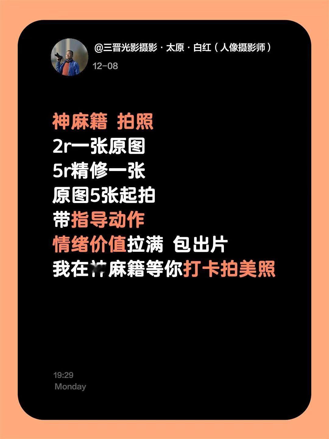 神麻籍 拍照 2r一张原图 5r精修一张 原图5张起拍 带指导动作 情绪价值拉满 包出片 我在神麻籍等你打卡拍美照拍照摄影 太原约拍 太原 摄影拍照