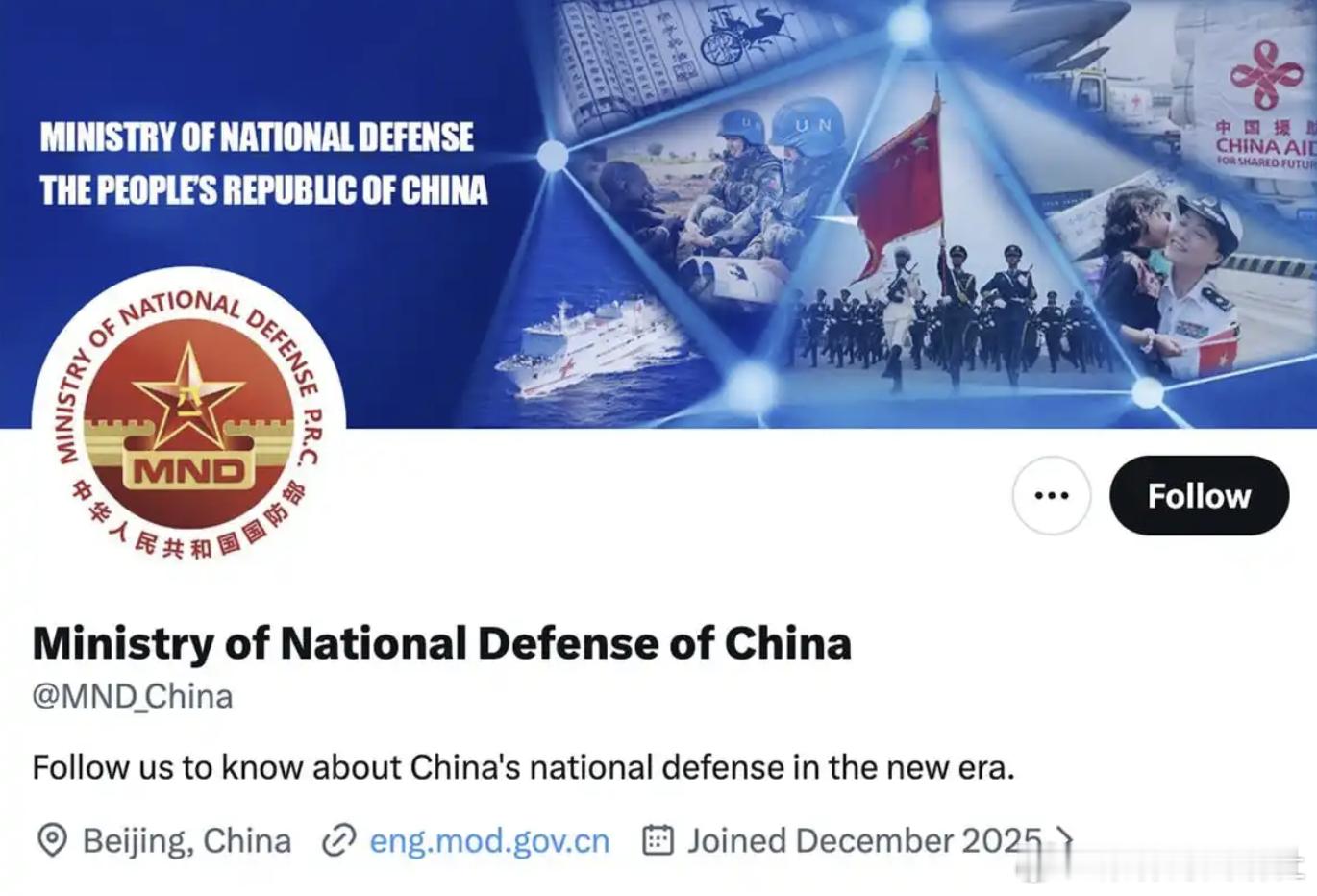 祝贺中国国防部开通首个海外社媒账号 祝贺中国国防部迈出这一重要一步。中国国防部于2025年12月8日在海外社交媒体平台X(原Twitter)正式开通官方账号,账号名为“Ministry of National Defense of China”(账号简介为“关注我们了解新时代的中国国防”,旨在通过该平台分享中国故事和中国军队的故事。首条贴文配发了一段约1分钟的宣传视频,展示了中国军队演习训练、执行海外任务、参与国内应急救灾等画面,视频英文序言强调:“和平是人类的共同愿望和崇高目标。中国军队始终是维护世界和平的坚定力量。”这一举措标志着中国国防部首次正式进驻国际主流社交媒体平台,有助于增进国际社会对中国国防政策和军队发展的了解,促进双向交流。