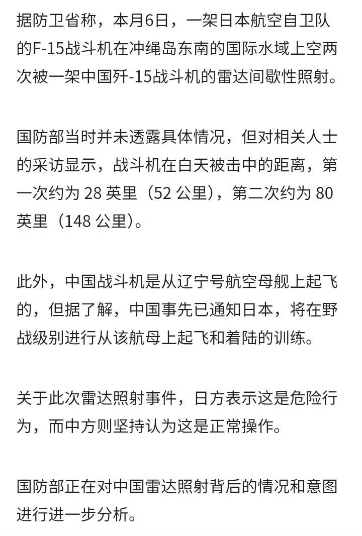 照射距离52公里和148公里!日本NHK披露了事件详情,第一次两架战斗机相距约52公里,第二次相距约148公里! 日本自卫队滋扰辽宁舰训练热点观点烽火问鼎计划