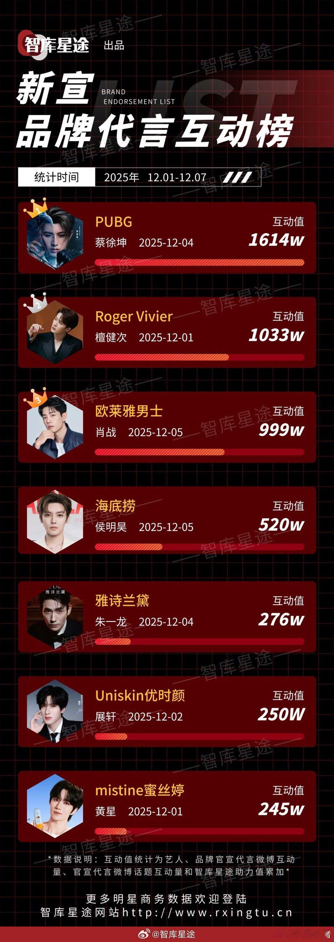 上周新宣品牌代言互动榜蔡徐坤檀健次肖战侯明昊朱一龙展轩黄星