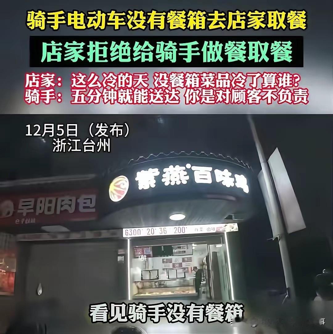 一份热餐的温度,藏在彼此的体谅里 浙江台州的一场取餐小插曲,让“外卖配送”里的责任与温度成为热议焦点。骑手匆匆而来,未带餐箱便想取餐,直言“五分钟就到,不用餐箱”;店家却坚持原则,轻声反问“这么冷的天,菜凉了算谁的?” 没有激烈的争执,却藏着两种立场的考量:骑手或许是想节省时间、提高效率,却忽略了菜品温度对口感的影响,更忘了顾客收到冷餐时的失落,以及商家可能面临的投诉与口碑损失;店家拒绝的不是骑手本身,而是对“敷衍配送”的不认同——一份用心做好的餐食,值得从后厨到顾客手中,都保持应有的温度与品质。 网友们的评论道出了多数人的心声:“不是谁发视频谁有理,这波我支持商家”。其实,这场小矛盾里没有绝对的对错,却藏着“换位思考”的重要性。骑手多一份对菜品的负责,少一分图省事的侥幸,就能减少不必要的纠纷;店家多一份对骑手不易的理解,或许也能换一种更温和的沟通方式。 外卖配送的链条上,商家、骑手、顾客缺一不可。一份热餐的传递,不仅需要速度,更需要责任与体谅。愿每一位骑手都能重视配送细节,守护好餐食的温度;愿每一位店家都能被温柔以待,用心做好的美食能被好好送达;也愿我们都能多一份换位思考,让这场双向奔赴的配送,多一份温暖,少一份隔阂。毕竟,比起“谁有理”,更重要的是“怎么让每份餐都热乎,每个人都舒心”。温岭外卖 滚烫点餐 点餐超时 素材来源于网络,侵权删除。