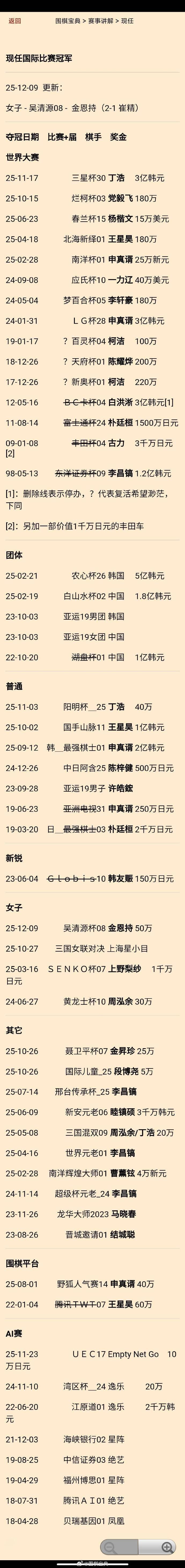 新的世界大赛棋仙战登场:2025年12月主要围棋赛事 围棋 02日:至7日,第3