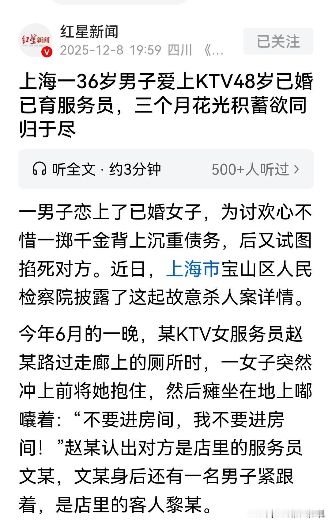 上海,一KTV女服务员逃出包间,在走廊看到同事,上前一把抱住求救。一男客人试图将女子拖回包间,同事叫来了负责人,将女子和男客人带回休息室,负责人发现,女服务员脖子上有明显的掐痕,女服务员惊恐的表示,要将男客人赠送的金银首饰退还,不再来往,而男客人反复哀求复合,并主动报警。民警赶到后,男客人说了一句话,惊呆了所有在场的人。 事情的起因:一个是贪财,一个是痴情。 36岁的黎某,因各种原因十几年来都未谈过恋爱。 3个月前,黎某和朋友在KTV消费,认识了陪酒服务员阿文。 两人相谈甚欢,越聊越投机,黎某临走特意加了阿文的联系方式。 之后,黎某经常来KTV消费,还特意点阿文的包间,给她增加收入。 一来二去,两人熟悉起来,黎某为了讨好她,经常在KTV花起钱,从不手软。 在两人的相处中,阿文告诉黎某,自己比她大12岁。 而且有家庭,还有两个孩子,只是和丈夫的感情不太好。 本以为黎某会知难而退,没想到,在得知阿文的底细后,黎某不但没有收敛,反而认为,阿文只是暂时不能和自己在一起。 他没有和阿文断绝关系,还不断的给她买金银首饰。 阿文在明知自己有丈夫、有孩子,和黎某不可能在一起的情况下,仍然接受李某的礼物,和感情馈赠。 阿文的行为,给了黎某错误的理解,使他在这段不正常的感情中深陷,而不能自拔。 黎某并没有高工资供他消费,他手里的那点积蓄,仅维持了3个月后就花光了。 黎某为了维持这段本就不正常的关系,开始不断的从朋友那里借钱,甚至不惜贷款20多万。 虽然黎某为了阿文,不惜一掷千金,还背上了债务。 但他却发现,阿文对他越来越冷淡,甚至还对她爱答不理。 他去KTV消费,阿文明显不想接待他。 多次之后,黎某便心生怨恨,他认为,自己不惜一切给阿文买金项链、金手链,换来的却是这种结果。 给了希望又失望的愤怒,让黎某失去了理智,他决定要和阿文一起同归于尽。 事发当天,黎某揣了一把水果刀,再次来到阿文上班的KTV,想最后潇洒一次就实施犯罪行为。 黎某在进入KTV后,直接点了阿文的包间,为了工作,阿文只好配合。 黎某点了酒,两人在包间里一边喝酒一边唱歌。 期间,黎某上前拉阿文的手,却被阿文厌恶的甩开。 她的抗拒,瞬间点燃了黎某的怒火。 黎某趁着阿文点歌的机会,突然从后边掐住了她的脖子。 阿文身材瘦小,而黎某是有着将近300斤吨位的壮年男子,双方的力量太悬殊了。 尽管阿文拼命的挣扎,却一点呼救声的声音也发不出来,很快就被掐晕瘫倒在地。 黎某瞬间清醒了,他一时慌了神赶紧松了手。 他担心有人听到动静后进入包房,急忙拖了一把椅子抵住房门。 并上前试探阿文的鼻息,发现她还有呼吸,此时他也后悔了自己的行为,没再伤害阿文。 几分钟后,阿文醒过来,她不敢再激怒黎某,说了软话安抚他的情绪。 又说自己要上厕所,让黎某打开了房门。 阿文不顾一切的冲出包间,在走廊正碰上同事赵某。 阿文惊慌失措,一把抱住赵某瘫软在地,口里喃喃的自语:不进房间,我不要进房间! 赵某以为阿文喝醉了酒,正要安慰她,这时候黎某上前,想把阿文拖回房间。 赵某觉得不对劲,他让黎某先回房间,自己陪着阿文醒酒。 黎某不同意,赵某马上通知了前台负责人单某,把阿文和黎某带回休息室。 单某注意到,阿文的脖子上有明显的掐痕。 而阿文惊恐不安的表示,要把黎某送的金银首饰还给他,从此断绝来往。 而黎某却说:你没死就算了,我也不想死了,我们到此为止。 两人一个要求断绝关系,一个反复求复合,双方僵持不下。 黎某主动掏出手机报了警,民警介入后,李某竟然掏出一把水果刀说:今天带刀来,就是要弄死她! 最终,李某被检方以故意杀人罪(中止)对其提起了公诉。 《刑法》第232条规定:故意杀人的,处死刑、无期徒刑或者10年以上有期徒刑;情节较轻的,处3年以上10年以下有期徒刑。 黎某因阿文对其态度冷淡,心生怨恨,携带水果刀到KTV。 趁阿文点歌时,从背后掐住她的脖子,其行为符合故意杀人罪的构成要件,已构成故意杀人罪。 尽管最终阿文未死亡,但黎某主观上有剥夺阿文生命的故意,客观上实施了掐颈这一危害他人生命的行为。 若不是其及时收手,很可能导致阿文死亡结果的发生,故应受到该条款的约束。 《刑法》第24条规定:在犯罪过程中,自动放弃犯罪或者自动有效地防止犯罪结果发生的,是犯罪中止。 对于中止犯,没有造成损害的,应当免除处罚;造成损害的,应当减轻处罚。 黎某在掐晕阿文后,主动松开手,且在确认阿文有呼吸后未再实施伤害行为,其在犯罪过程中自动放弃了继续杀害阿文,属于犯罪中止。 不过,阿文脖子上留下了明显掐痕,身体受到了一定伤害。 黎某虽可因犯罪中止而减轻处罚,但仍需承担相应的刑事责任。 关注@赵哥的法律观明辨是非不上当。