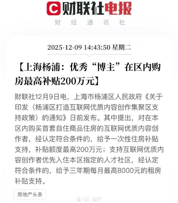 上海杨浦:优秀"博主"在区内购房最高补贴200万元