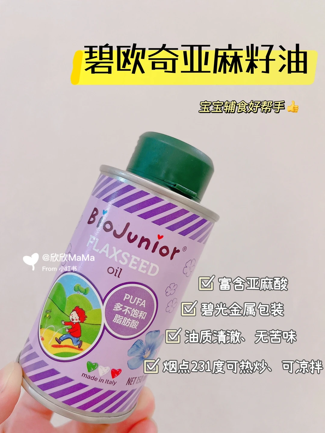 🔻我用的辅食油是碧欧奇家的亚麻籽油,它油质纯,且烟点有231度,可热炒也可凉拌。它的不饱和脂肪酸高达90%,无论是给宝宝直接加进米粉里或者粥、面条里,或直接用于热炒都很方便,宝宝更爱吃哦!而且是金属包装,能更好地保存!
