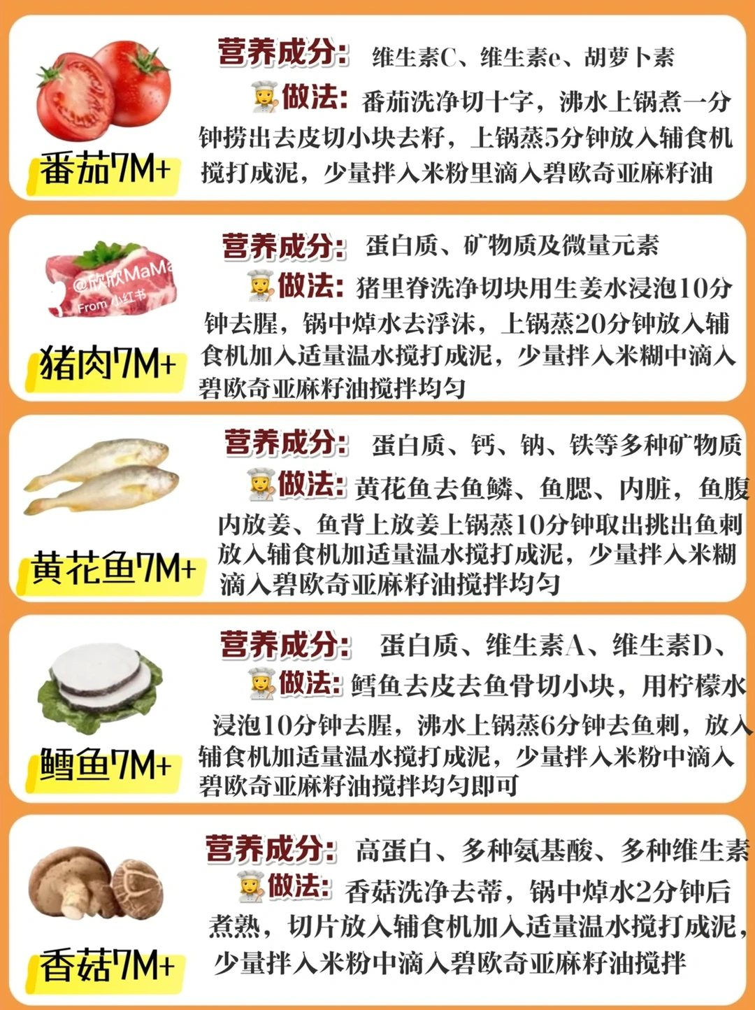 ⚠️每添加一种食材3天排敏期,食材都拌入米粉里滴入亚麻籽油搅拌食用,水果泥单独吃!