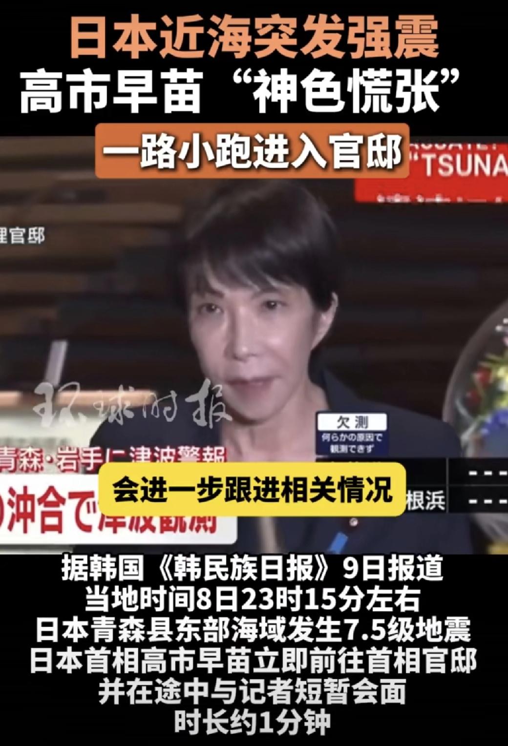 当地时间2025年12月8日23时15分,日本青森县东部海域发生7.5级地震。日本首相高市早苗紧急赶赴首相官邸,其神色慌张、一路小跑进入危机管理中心的画面被媒体捕捉,引发广泛关注。 据《韩民族日报》报道,高市早苗抵达首相官邸后,用约1分钟向媒体简要说明形势,称已在官邸设立了对策室,随后便小跑进入官邸危机管理中心。多国媒体以“神色慌张”“眼神闪躲”等词描述这一瞬间。 这一画面引发了公众对其危机应对能力的讨论。舆论指出,在灾难时刻,领导人的镇定与果决是公共信心的基石,高市早苗的表现与其呼吁民众“自己的生命自己守护”的口号形成反差,容易被解读为慌乱与失控,可能会影响民众对政府应急能力的信任。