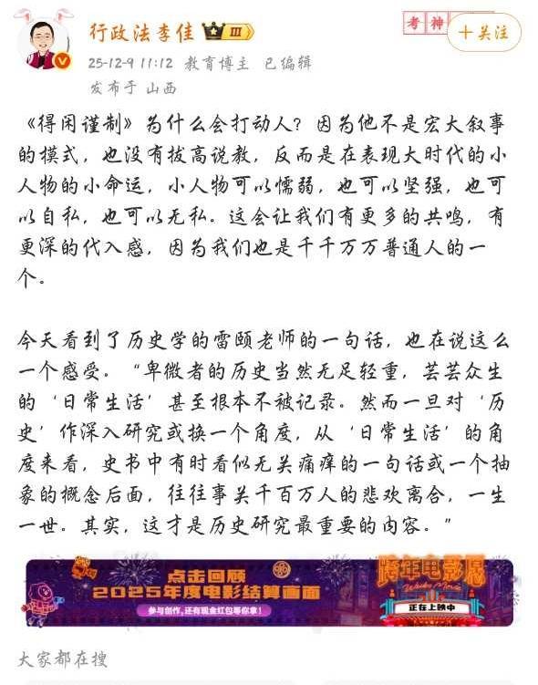 《得闲谨制》这波热度起得有点意思,不是因为场面多宏大,而是它终于肯低头看看咱们这些“小人物”了。 说实话,看多了神仙打架,这种扎进泥土里的故事才真叫人心里发酸又发烫。 圈里都在传,连社科院的历史大咖雷颐老师都被惊动了。 人家话说得很透:历史不光是那些大写的人名和年份,更是咱们普通老百姓的一日三餐、悲欢离合。 这几年风向确实变了,从《人世间》到《山海情》,大家发现没? 能爆火的剧,全是在讲“过日子”。 不再是高高在上的宏大叙事,而是把镜头对准了街头巷尾,这种“眼光向下”的视角,才是真把观众当自己人。 咱们在历史长河里可能是微尘,但在自己的生活里那都是主角。 这种关注普通人命运的作品,不仅是在补全历史的拼图,更是在致敬每一个努力活着的你我。 如果把你现在的日子拍成电影,你觉得最动人的一幕会是什么? 评论区聊聊,咱们一起拼凑点人间烟火气。