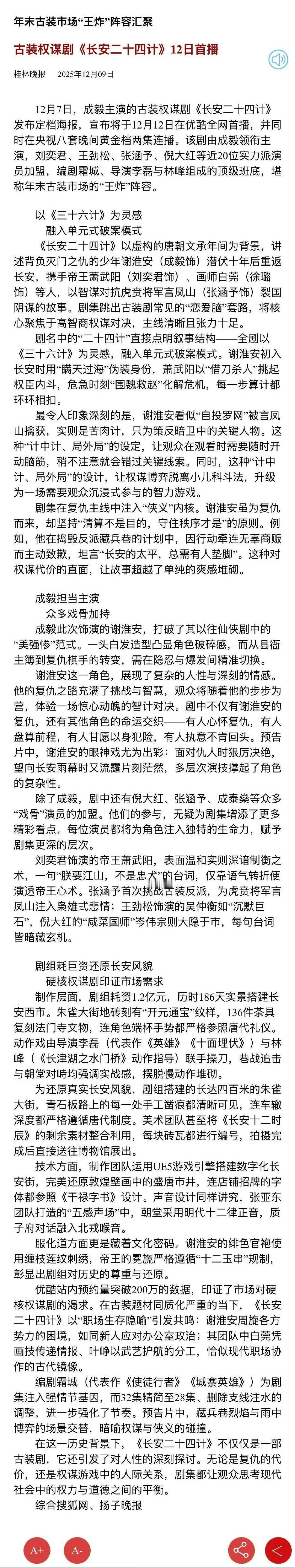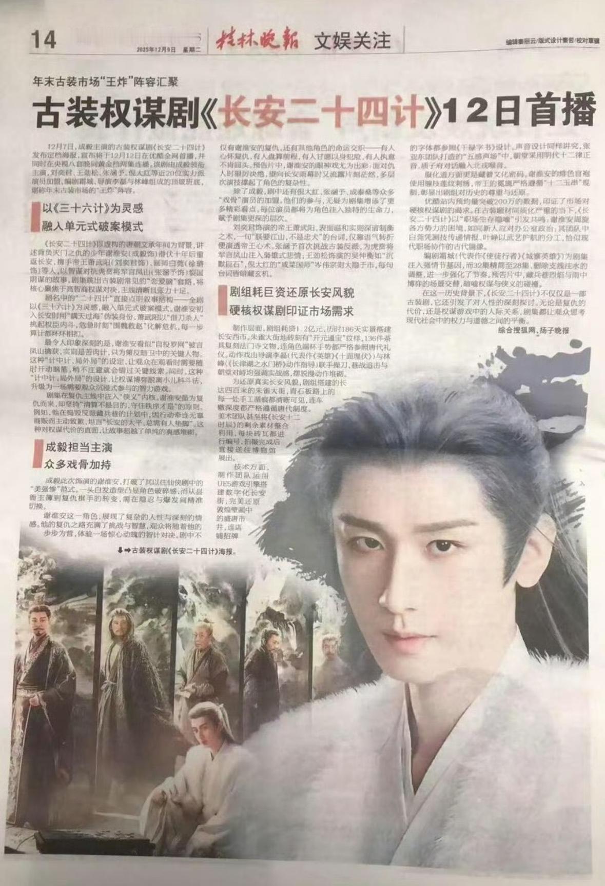 桂林晚报整版超大篇幅介绍:古装权谋剧长安二十四计12日首播,年末王炸阵容。纸媒还是有很感觉哈,这么大一个ee。连播三部剧,ee辛苦了,iejj也辛苦了。谢大人,复仇吧!!!!!!!!!!!!!!