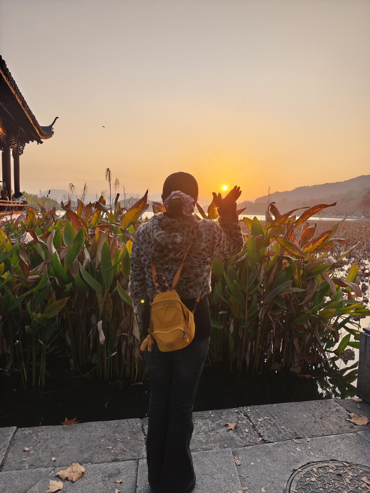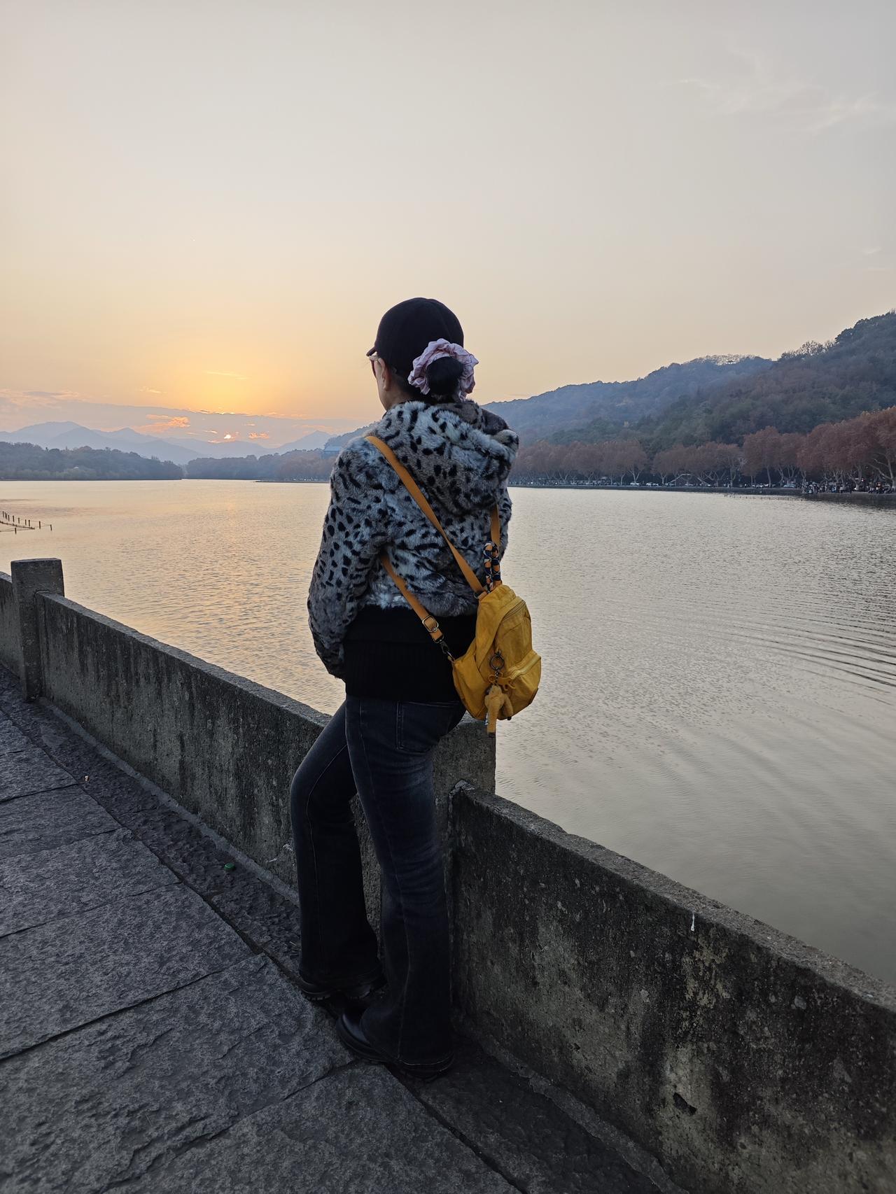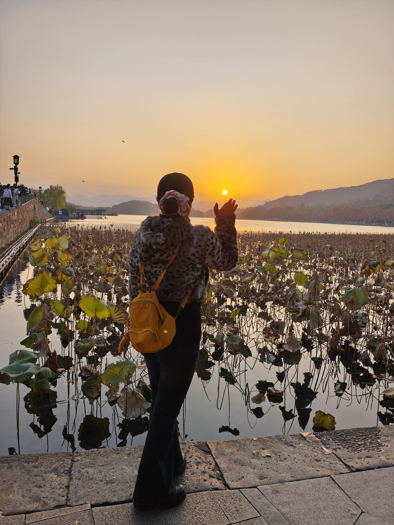 夕阳之下,冬日的西湖断桥美景一览无余,美的不可描述,只有用内心去感受! 湖中焦黄色的荷叶在夕阳的映射下变得更加魔幻起来,仿佛在向过往的行人述说着白娘子与许仙相会的感人场景。