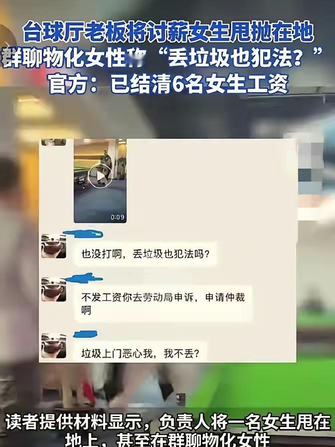 台球厅的老板将讨薪的19岁女生一把抱摔在地上,在跟别人聊天的时候,还将自己的这一个行为说成是扔垃圾。 我扔垃圾也犯法吗? 台球厅里面还有六个小女生,全部都没有拿到这个老板许诺给的工资。 直到帽子叔叔调解之后 才发给这个女孩3000块钱工资,这样的老板还是人吗?