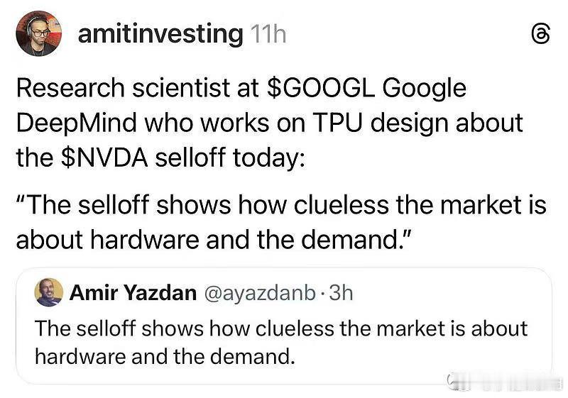 这是一条关于AI硬件市场认知与英伟达股票抛售的观点分享,可从以下几点分析:• 核心观点:谷歌DeepMind研究科学家Amir Yazdan指出“这次抛售表明市场对硬件及其需求有多么缺乏了解”,其中“抛售”针对的是英伟达股票的卖出行为。• 行业背景:这反映出在AI硬件(如GPU、TPU)领域,市场对技术需求、硬件迭代节奏的认知存在偏差。英伟达作为GPU领域的龙头,其股价波动常被视为AI算力市场的风向标,而Amir Yazdan的观点则从硬件技术与需求的专业视角,指出市场判断的局限性。• 人物背景:Amir Yazdan是谷歌TPU协同设计研究、机器学习与加速器设计领域的专家,其对硬件市场的评价具备技术权威性,也侧面体现了谷歌在AI硬件(TPU)领域的技术立场与市场观察。