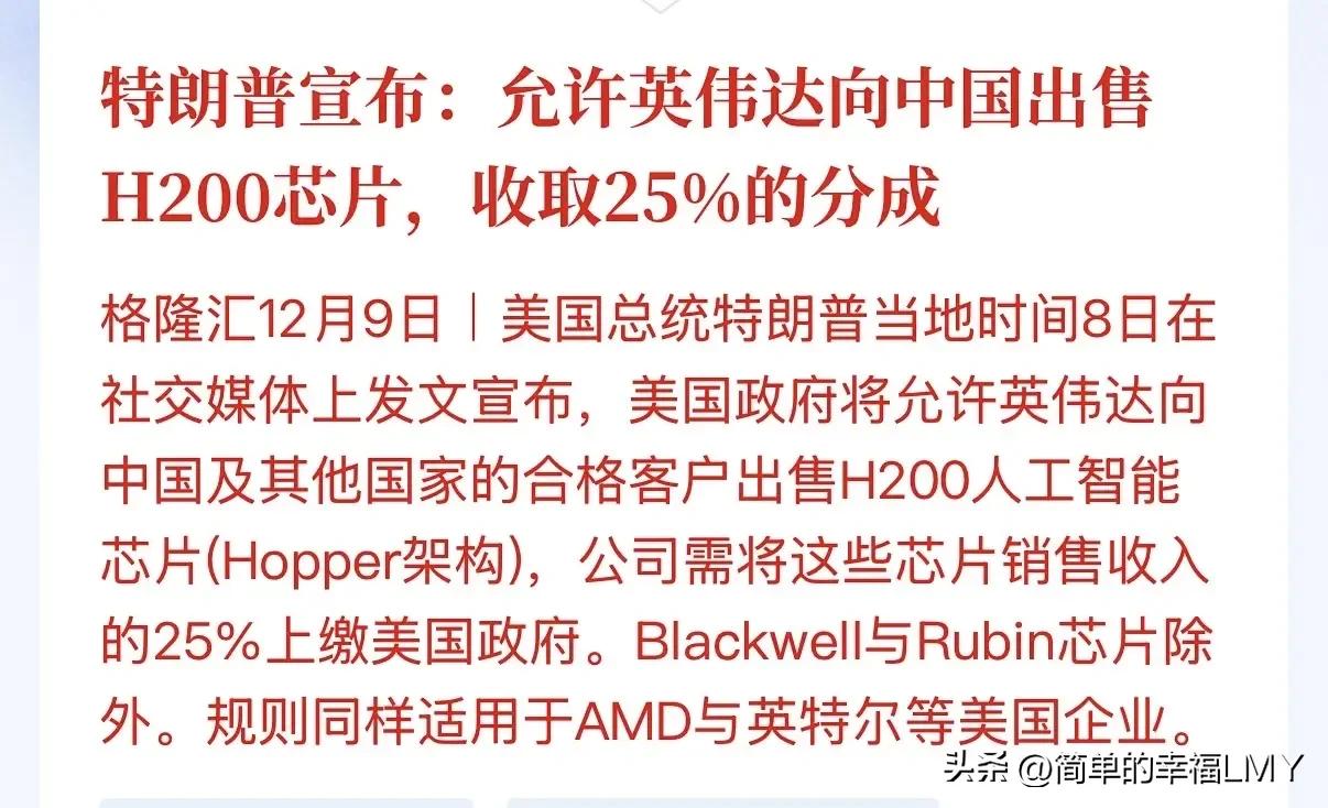 继黄仁勋12月3日宣布美国将放开H200人工智能芯片后,特朗普刚刚也宣布了这一消息。 12月3日黄仁勋率先官宣美国放开H200人工智能芯片对华出口后,特朗普紧随其后再次确认这一消息,看似是对华芯片限制的松动,实则藏着精打细算的算计,这般送上门的所谓先进芯片,中国根本没必要稀罕,更不会当成香饽饽追捧。 不可否认,H200人工智能芯片性能远超此前对华出口的阉割版H20,算力提升肉眼可见,在人工智能训练、大数据处理等场景下有着不错的适配性,但即便如此,它在英伟达的芯片体系里依旧算不上顶尖。 真正的核心技术仍被美国牢牢攥在手里,最先进的Blackwell芯片当前对中国严防死守,即将推出的Rubin芯片也早已被纳入禁售清单,只把迭代下来的产品放行对华出口,本质上就是把中国当成二手货接盘侠,这般区别对待的套路,中国早已看得通透。 咱们向来有骨气有底气,从不屑于捡别人剩下的东西,当年H20进入中国市场后反响平平,没能掀起水花,如今的H200大概率也会重蹈覆辙,难逃无人问津的命运。 美国突然松口允许H200对华出口,绝非良心发现,更不是想助力中国人工智能产业发展,核心原因只有一个,中国已经能自主研发出性能与之持平的人工智能芯片,美国的技术垄断壁垒已然被打破。 自家能造出好用够用的产品,何必花钱去买别人的东西?难道非要主动把脖子伸出去,等着被美国卡喉咙才甘心吗?显然不可能。中国人工智能产业的发展,早已过了依赖外部供给的阶段。 自主研发的芯片在算力、功耗、适配性上都能匹配国内产业需求,从技术安全到供应链稳定,都远比依赖进口更有保障,美国此时放开H200出口,不过是想趁着自家产品还有些许市场空间,抢占部分份额捞取利益,这般小算盘,根本瞒不过中国企业和市场的眼睛。 退一步讲,即便未来美国松口,允许Blackwell、Rubin这两款顶尖芯片对华出口,中国也该保持清醒理智,绝不能大量采购。适度引进或许能用于技术参考、场景适配对比,但绝不能让外来芯片打乱中国自主人工智能芯片的发展节奏。 自主可控才是产业发展的根本,一旦过度依赖进口顶尖芯片,国内芯片企业的研发动力会被削弱,产业链的完善进度会受影响,长久来看,只会再次陷入被外部卡脖子的被动局面。 人工智能产业的核心竞争力,终究要靠自主技术支撑,外来芯片再好,也只能是补充,不能成为主流,这是中国产业发展必须坚守的底线。 当下人工智能行业有个鲜明的现状,芯片技术的迭代速度远超应用落地的节奏,大量先进算力处于闲置状态,人工智能应用场景的开发还跟不上芯片性能的提升,这恰恰给中国半导体产业和人工智能芯片研发留出了宝贵的窗口期。 这段时间不算漫长却至关重要,中国必须牢牢抓住机遇,集中力量攻克核心技术瓶颈,完善半导体产业链上下游布局,从芯片设计、制造到封装测试,每一个环节都要稳步推进,补齐短板强化优势。 在人工智能应用大规模爆发之前,把自主芯片的性能打磨到位、产能稳定下来、成本控制合理,等到应用需求井喷之时,就能凭借自主可控的芯片体系抢占市场主动权,实现从跟跑到并跑再到赶超的跨越。 这些年美国对中国芯片产业的打压从未停歇,从技术封锁到设备限制,层层围堵之下,中国芯片企业反而越挫越勇,不断突破技术难关,一步步拉近与国际顶尖水平的差距。 H200的解禁,看似是打压松动,实则是美国技术优势下滑后的无奈之举,当中国能造出同等性能的产品,其封锁也就失去了意义。但这并不意味着中国可以放松警惕,美国在顶尖芯片领域仍有优势,对中国的技术遏制不会彻底停止,稍有松懈就可能被拉开差距。 人工智能时代,芯片是核心基石,谁掌握了先进的自主芯片技术,谁就能在产业竞争中占据主导地位。中国从不缺攻坚克难的决心,也不缺持续研发的实力,只要稳住节奏、深耕技术,充分利用好当前的窗口期,不断提升自主芯片的性能和竞争力。 就能摆脱对外部芯片的依赖,构建起安全稳定的产业生态。美国的芯片解禁改变不了中国自主研发的大方向,更阻挡不了中国芯片产业崛起的步伐,未来中国必将在人工智能芯片领域闯出一片新天地,用自主技术撑起产业发展的一片天,真正掌握发展的主动权,不再受外部势力的牵制与干扰。