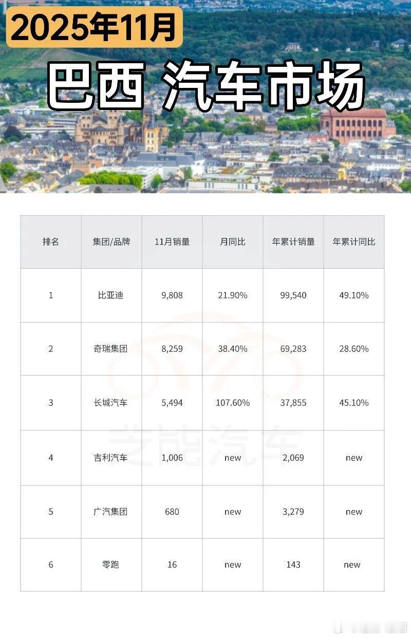 2025 年 11 月巴西轻型车市场销量同比微降,但整体规模仍处高位,传统头部品牌依旧主导,中国品牌却在加速突围。当月中国品牌销量超 2.5 万辆,市占率突破一成,全年累计占比也接近一成,比亚迪、奇瑞、长城成核心增长极。比亚迪稳居中国品牌榜首且跻身市场前十,长城同比翻倍增长,奇瑞也凭本地化优势稳步扩张。车型端燃油车仍为主流,但中国品牌新能源车型存在感正持续增强,巴西已成为中国车企出海南美核心阵地。