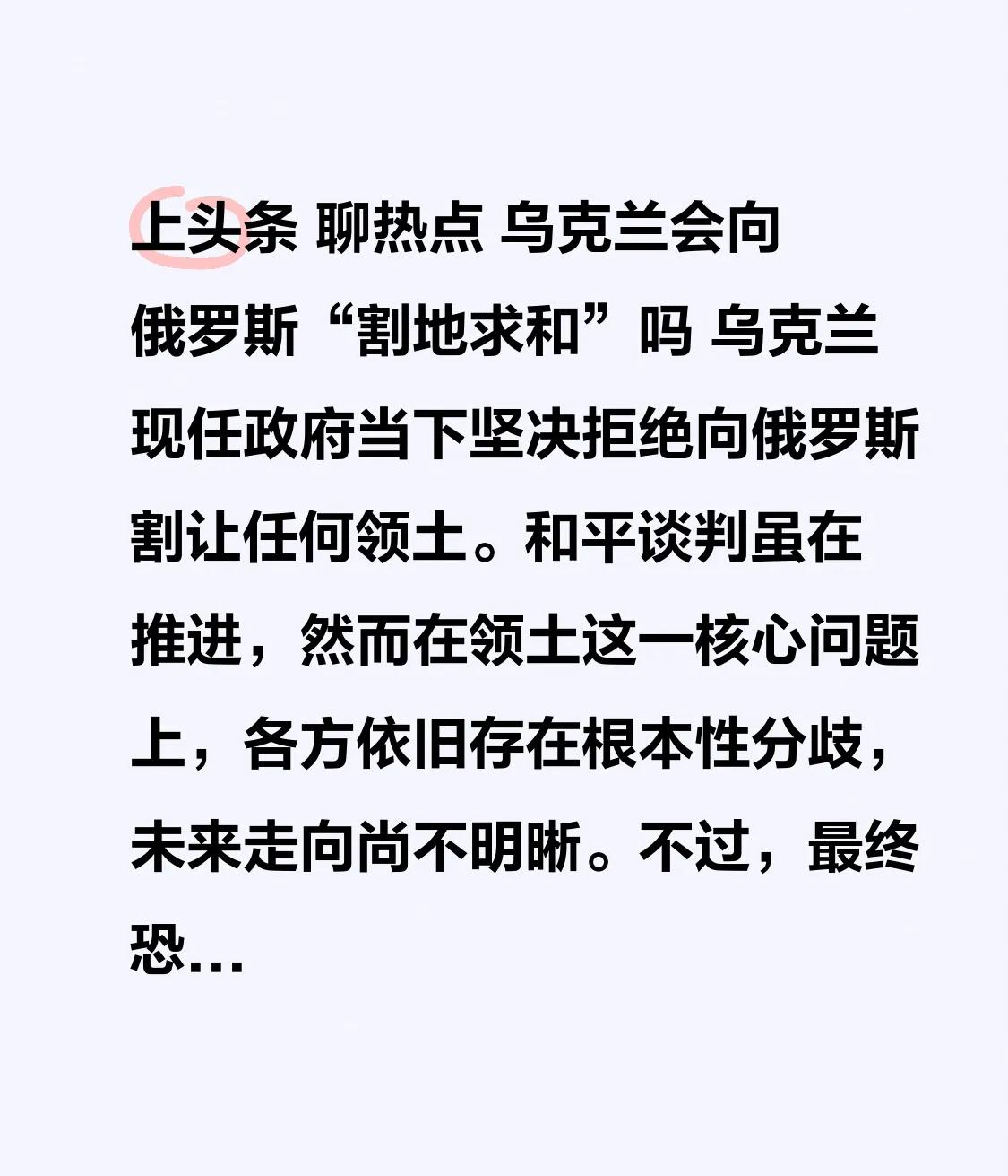 乌克兰会向俄罗斯“割地求和”吗乌克兰现任政府当下坚决拒绝向俄罗斯割让任何领土。和平谈判虽在推进,然而在领土这一核心问题上,各方依旧存在根本性分歧,未来走向尚不明晰。不过,最终恐怕还是得“割地求和”。