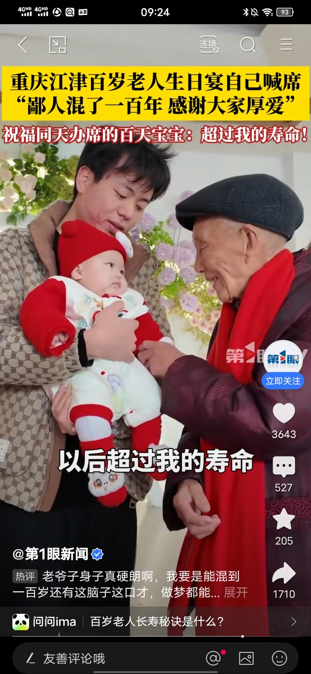 100岁老人生日自己喊席,全程脱稿思路清晰,还祝福同天办席的宝宝! 来自第一眼新闻的消息,视频中,这位百岁老人喊话,全程没有拿什么稿子,却口齿清晰,思路清晰,后面,还给同天办席的宝宝送祝福,祝宝宝活过他的岁数。 或许很多人都追求长寿,但大都是生活里过得舒坦,很少磨难的人吧。其实,不管是否长寿,身心健康才是最重要的,心情舒畅,身体自然更健康,身体健康自然也能长长久久。 现在人们大都生活在重压之下,能过得轻松的少之又少,但是我们就要懂得这个道理,面对现实,大家都不容易,好好过好自己的每一天,保持乐观开朗的心态,一切也都会越来越好!祝福每一个心灵纯净的人都得偿所愿!