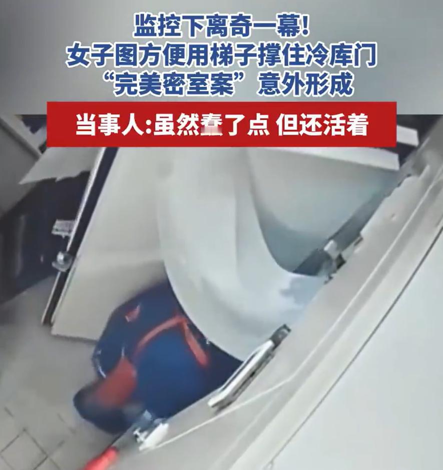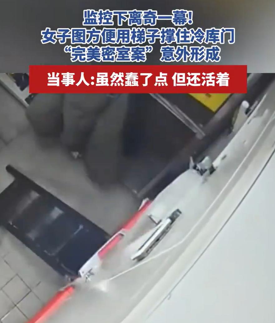 湖北,一女子在工作时为图方便用梯子撑住冷库门,没成想,自己刚走进去,冷库门也随着反锁带上了,一时间女子以为是人为的,后来查了监控,才发现是梯子滑倒了,网友:不经意间形成“完美密室案” 监控显示,女子把梯子斜着撑在冷库门边,看得出来就是想让门别完全关上,好进出方便一点。梯子腿和地面之间的角度不算稳,顶端只在门边缘蹭着一点。她估计也没多想,转身就往里面走 她刚迈进冷库,门因为重力自然往回带,梯子被轻轻一推,本来快要稳住的位置一下变得悬空。梯子往旁边滑,像慢动作一样,顺着力倒下去,最后卡在门和货架中间。门也在同一瞬间被带上,合得干干净净 幸好女员工身上带着手机,赶紧打电话求救,外面同事听到动静及时赶来,才把她从冷库里救出来。事后她自己回想起来也忍不住自嘲:虽然做法有点傻,但好歹人没事 有网友说:一把梯子,一个“图方便”的念头,差点酿成大祸!侥幸心理才是最大的安全隐患 细想一下确实如此,事情的点不在于梯子,也不在于冷库,而在于那种习以为常的小侥幸。很多事故不是因为谁胆子大,而是因为习惯让人觉得安全这件事理所当然。冷库这种地方温度低、空间封闭,一旦真被锁在里面,危险不是靠意志能扛过去的。带着手机就是最简单的自救工具,看起来不起眼,关键时刻能救命 我觉得,这个事给算是一个提醒,第一,随身带手机在一些场景真的是底线配置。第二,只要是带锁的封闭空间,哪怕进去几分钟,也别让门完全靠物件支着。第三,不要把自己的安全寄托在稳定性未知的物品上。梯子不是门栓,货架不是支撑点,靠它们撑门,迟早出事
