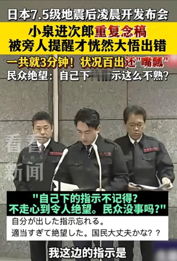 /日本刚遭了 7.5 级地震,老百姓正搁家攥着手机等救灾准信儿呢,结果防卫大臣小泉进次郎凌晨开的这场发布会直接给大家看傻了,就 3 分钟能把 “救命的紧急场” 整成 “念稿翻车现场” 也是没谁了。 北京时间 12 月 8 号晚上 11 点多,正是大家熟睡的时候,结果大地一哆嗦,东京都有明显震感,椅子晃了 20 多秒,睡得再沉的人也被晃醒了。 紧接着日本气象厅就发了海啸警报,说部分海域可能有 3 米高的浪,这消息一出来,北海道、青森县那些沿岸的老百姓哪儿还敢待在家里,连夜收拾东西往高地跑,光接到避难指示的就有 5.2 万户家庭,超 10 万人被迫离开家。 黑灯瞎火的,老百姓又冷又慌,就盼着政府能赶紧给个准信,说说救援咋安排、物资啥时候到、后续还会不会有余震。 就在这节骨眼上,防卫大臣小泉进次郎凌晨赶着开了场发布会,大家还以为能听到点实在消息,结果全程 3 分钟,简直是大型翻车现场。 这位大臣穿着笔挺的西装,对着稿子念得磕磕绊绊,一会儿卡壳一会儿重复,好不容易念完了,听众全懵圈了。 通篇没提一句救援进展,没说物资调配了多少,没讲避难所缺不缺东西,也没回应核废料池溢水的安全问题,净是些 “政府正密切关注灾情”“请民众遵守避难指示”“保持冷静” 之类的空话套话。 有网友录了发布会的视频,底下评论清一色的吐槽,说 “这 3 分钟还不如不说,纯属添堵”“还以为能听到点有用的,结果全是正确的废话”“老百姓在寒风里等救援,他在镜头前念稿子走过场”,还有人调侃 “是不是稿子没来得及背熟,怕多说多错”。 其实了解小泉进次郎的人都知道,他翻车也不是第一次了,这位官二代出身的大臣,仗着老爸是前首相小泉纯一郎的光环,在政坛一路顺风顺水,年纪轻轻就当过大臣,可能力却没跟着职位涨。 就在几个月前,他参选自民党总裁的时候,还被曝出团队搞 “刷好评” 的操作,给支持者发邮件,附上 24 条现成的夸赞话术,让大家去网络上给他造势,结果被媒体曝光,弄得舆论哗然,“退出总裁选举” 还冲上了热搜,他自己道歉说不知情,但大家也没怎么买账。 这次他刚在 10 月份的自民党总裁选举里败选,没过多久就被高市早苗内阁任命为防卫大臣,本以为他能收敛点,好好干活,结果遇到地震这种紧急情况,还是掉链子。 要知道防卫大臣在地震、海啸这种自然灾害面前,最需要的就是能快速反应、协调各方力量的人,结果小泉进次郎倒好,把救命的发布会开成了念稿走过场,难怪日本老百姓会失望。 现在日本民众的处境是真不容易,一边要躲余震,一边要担心海啸卷土重来,没电没水的还得操心物资够不够,核安全有没有保障,就盼着政府能给点靠谱的消息,结果等来这么一场敷衍的发布会。 说来说去,还是能力配不上职位,仗着家族的政治资源一路往上爬,却没真正把民众的安危放在心上。救灾不是作秀,不需要漂亮的稿子和光鲜的外表,需要的是实实在在的行动和负责任的态度。 小泉进次郎这场 3 分钟的翻车发布会,不仅让民众寒了心,也再次暴露了日本政坛某些政客的通病,只顾着自己的政治前途,却忘了当官的初衷是为老百姓服务。 现在日本老百姓还在避难所里煎熬,后续的余震风险还没解除,希望日本政府能赶紧拿出点实际行动,别再让这种 “念稿式发布会” 浪费大家的时间,也别再让民众的期待一次次落空。